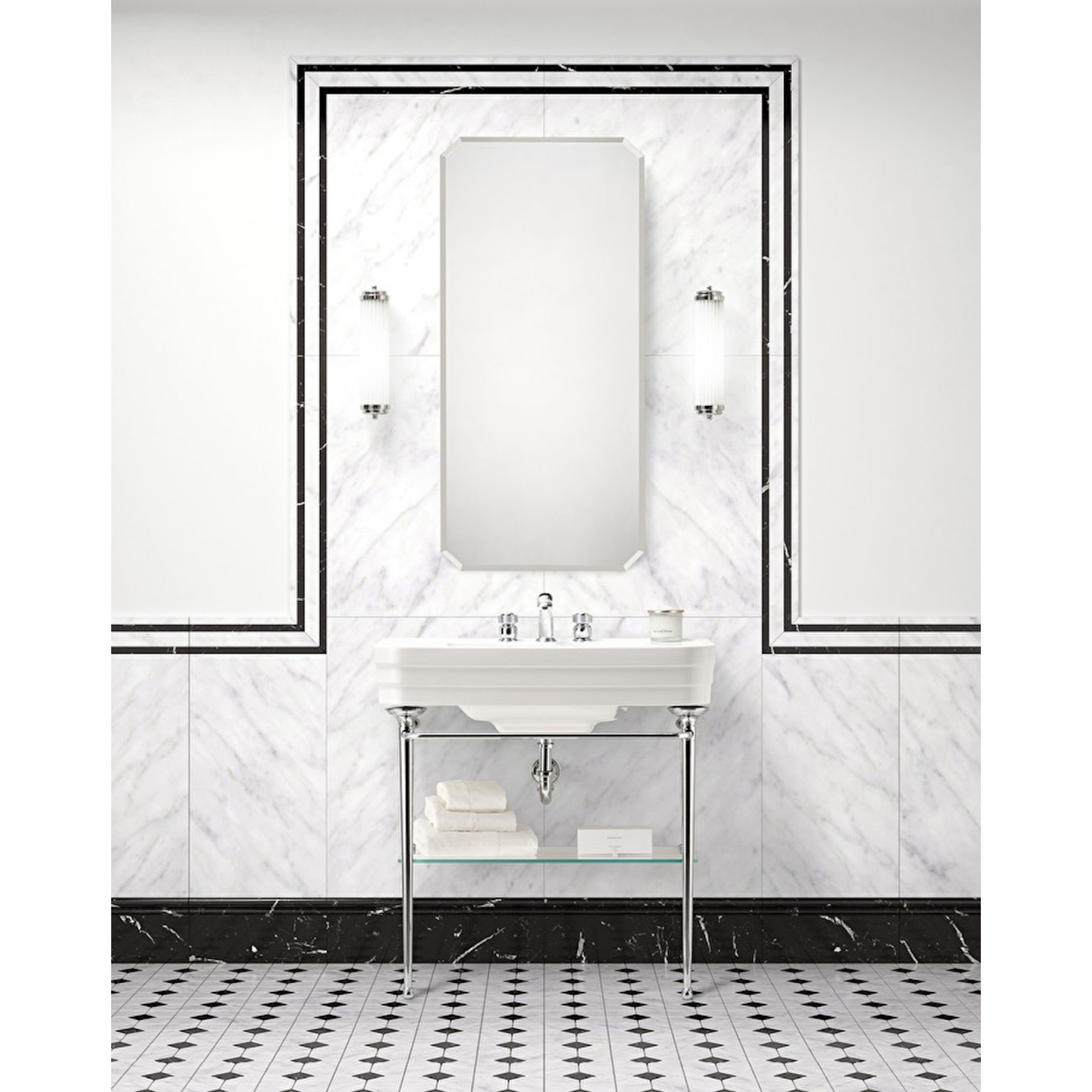 The NOBEL console in porcelain combines the Art Deco style with contemporary comfort. The console is composed of a brass structure in different finishes: Bronze, Chrome, Polished Nickel, Clear Gold. Noble consists of three towel bars and a transparent glass shelf.