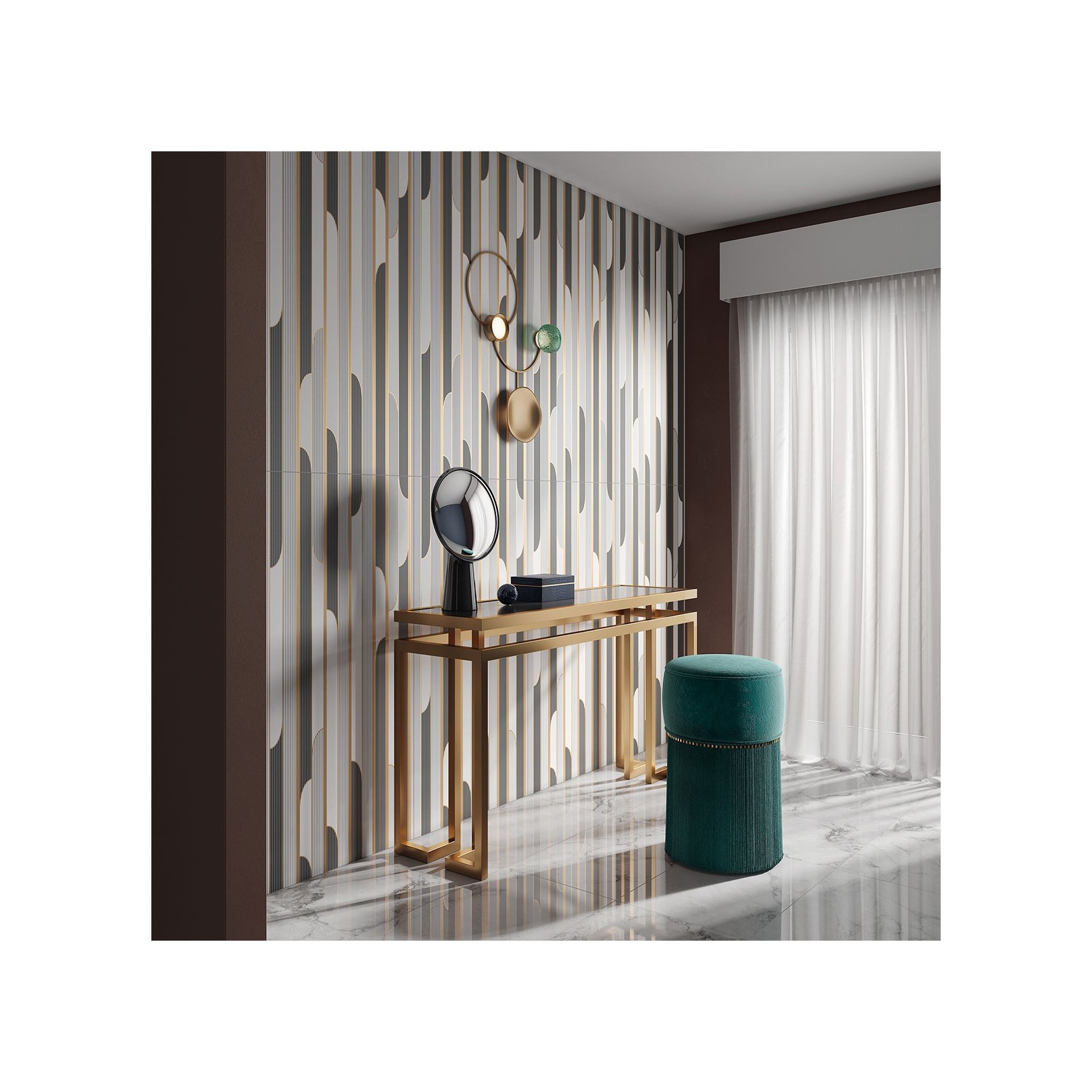 Decorative panels in porcelain stoneware, designed to be combined with any type of tile.Showall was born with a third-fire processing, in 120x60 and 120x120 formats, with continuous or modular decorations. The series is suitable for any type of environment.