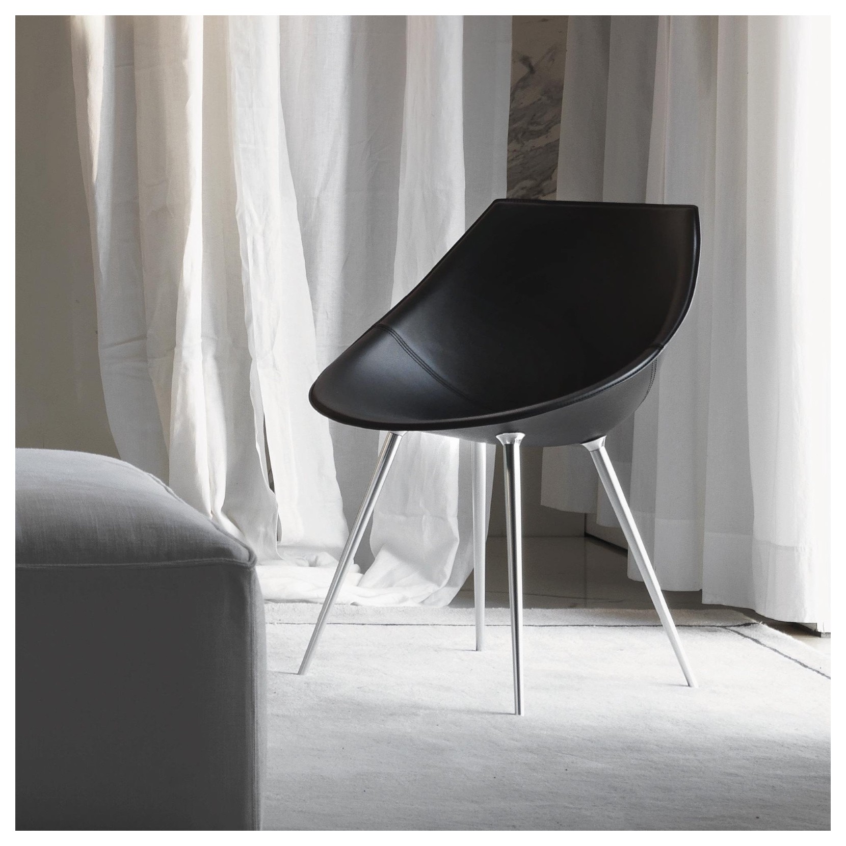 A enveloping leather shell supported by "pin" legs in anodized aluminum. Lagò is a chair designed by Philippe Starck available in a version in lacquered rigid polyurethane.