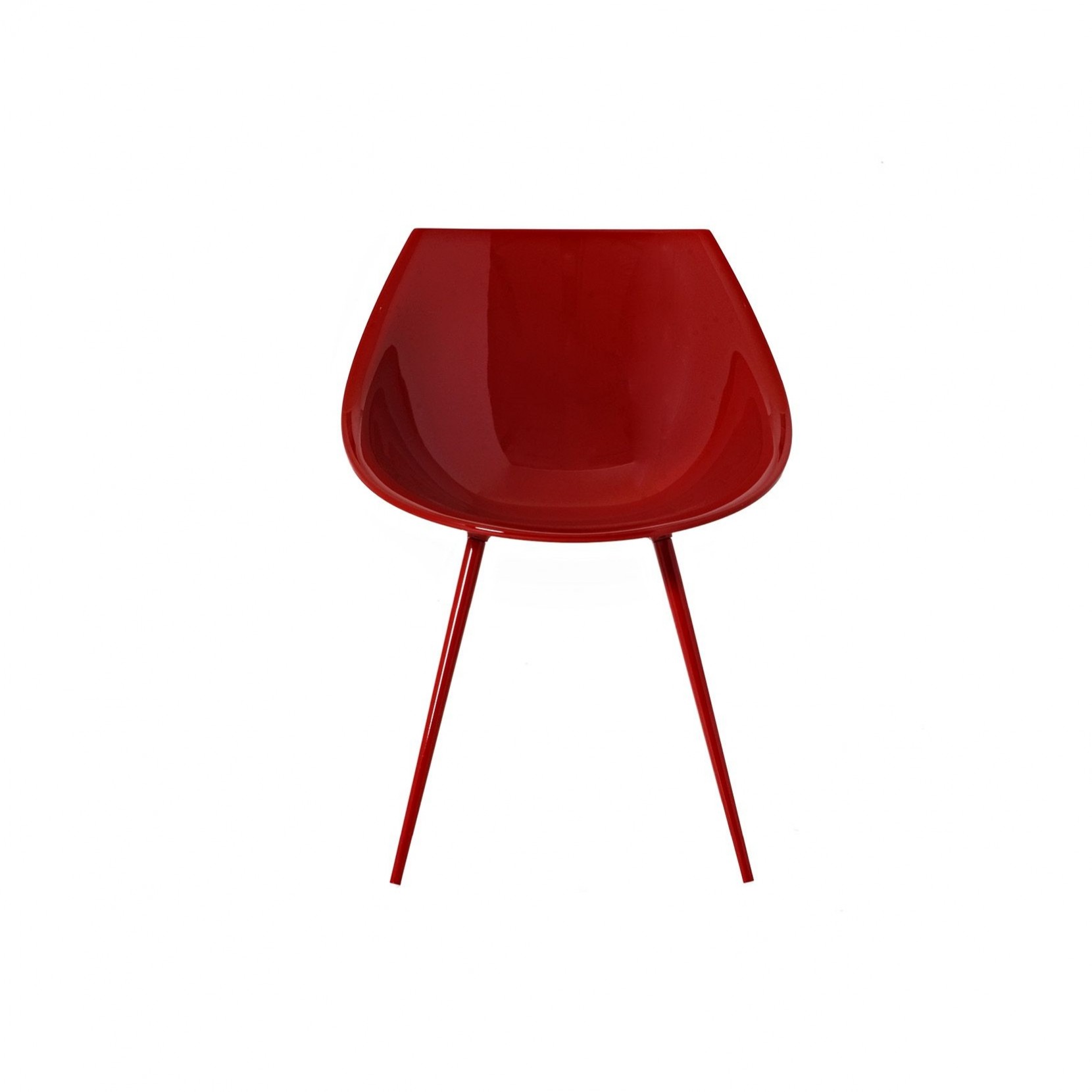 A enveloping and luminous shell in rigid polyurethane supported by pin legs in lacquered aluminium.