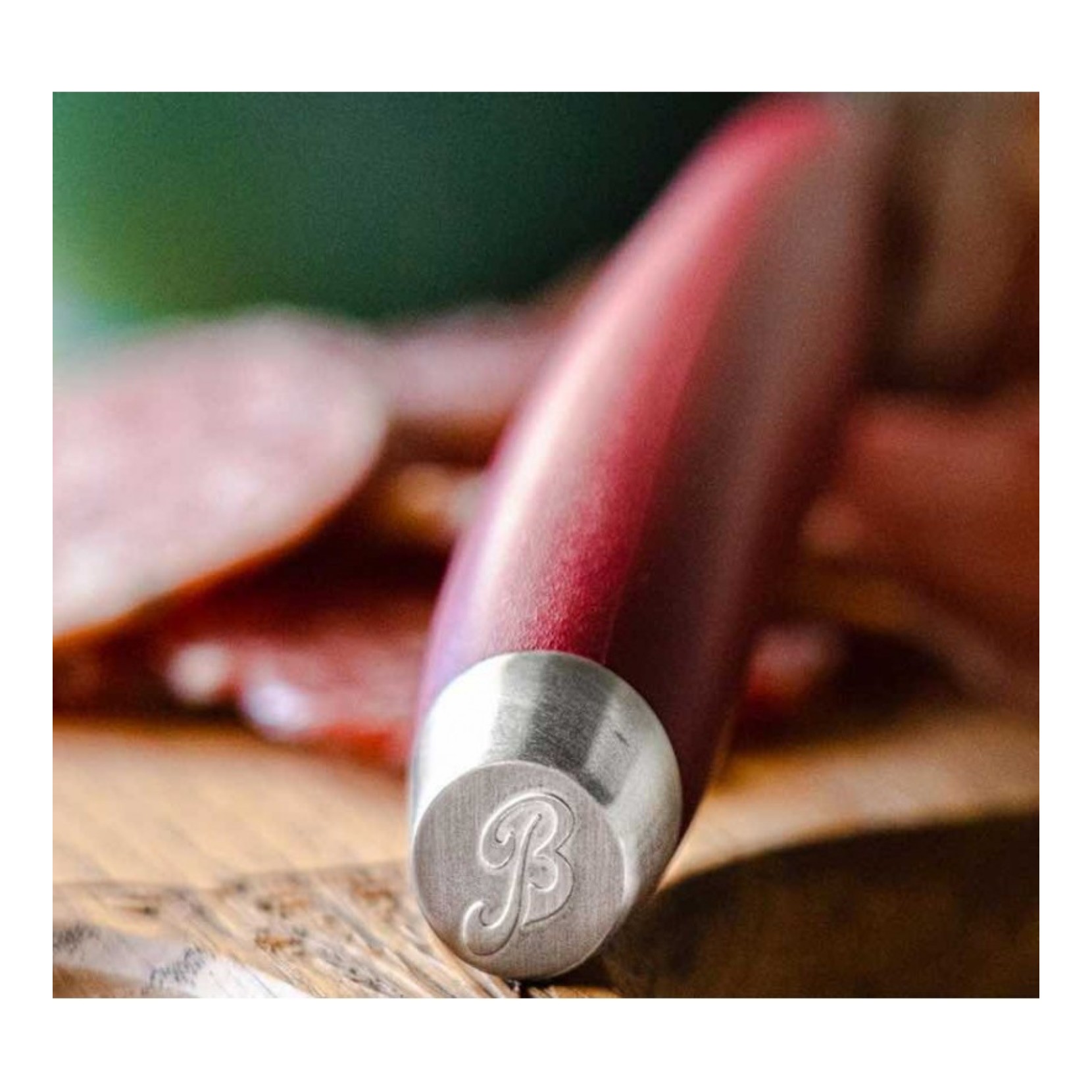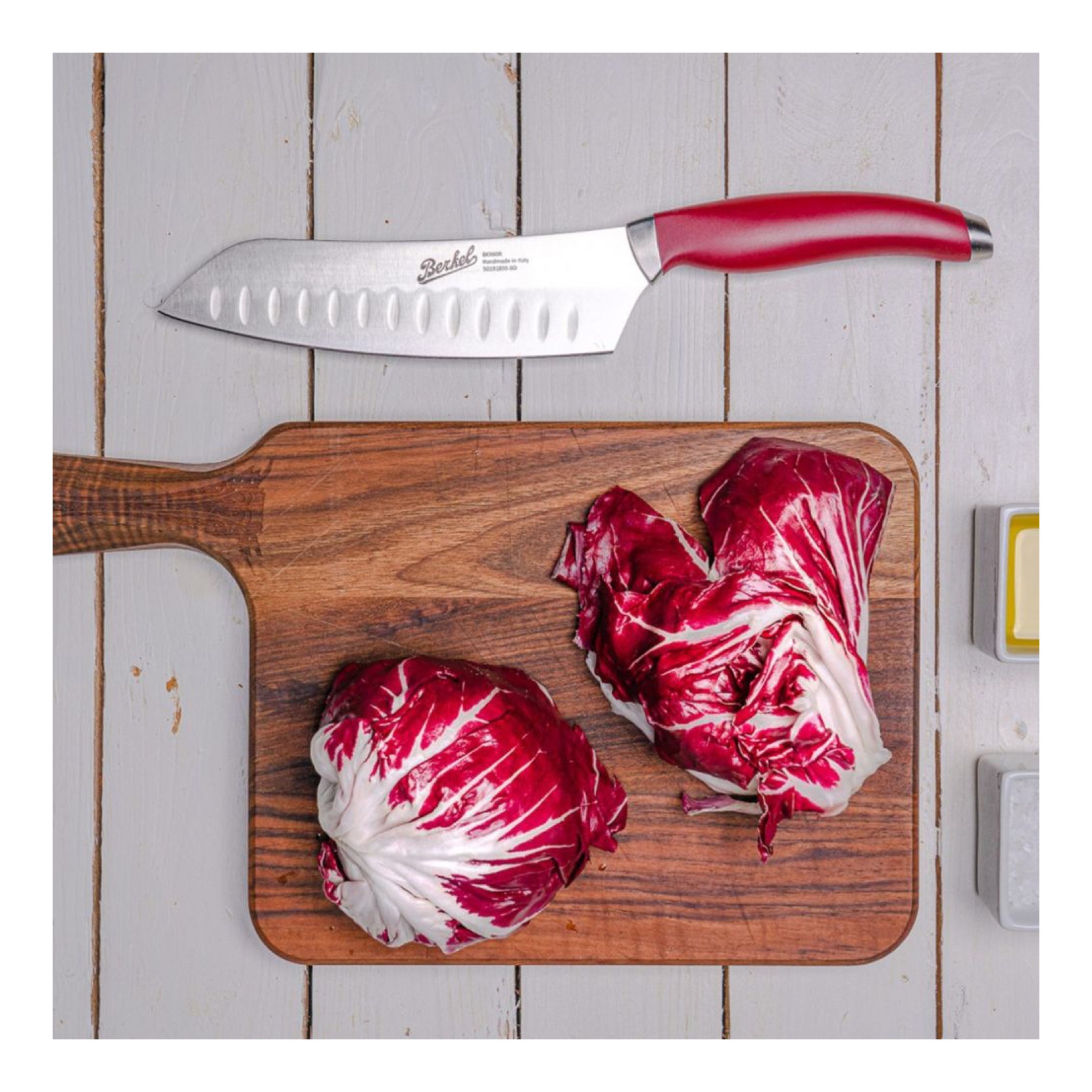 Robust and handy knife with a balanced ratio of weight and rigidity. The blade makes a clear reference to the Japanese design , a kitchen tool that lends itself to any type of food, from meat, fish, fruits and vegetables even of large caliber. The characteristic alveoli facilitate the dustacco of the slices.