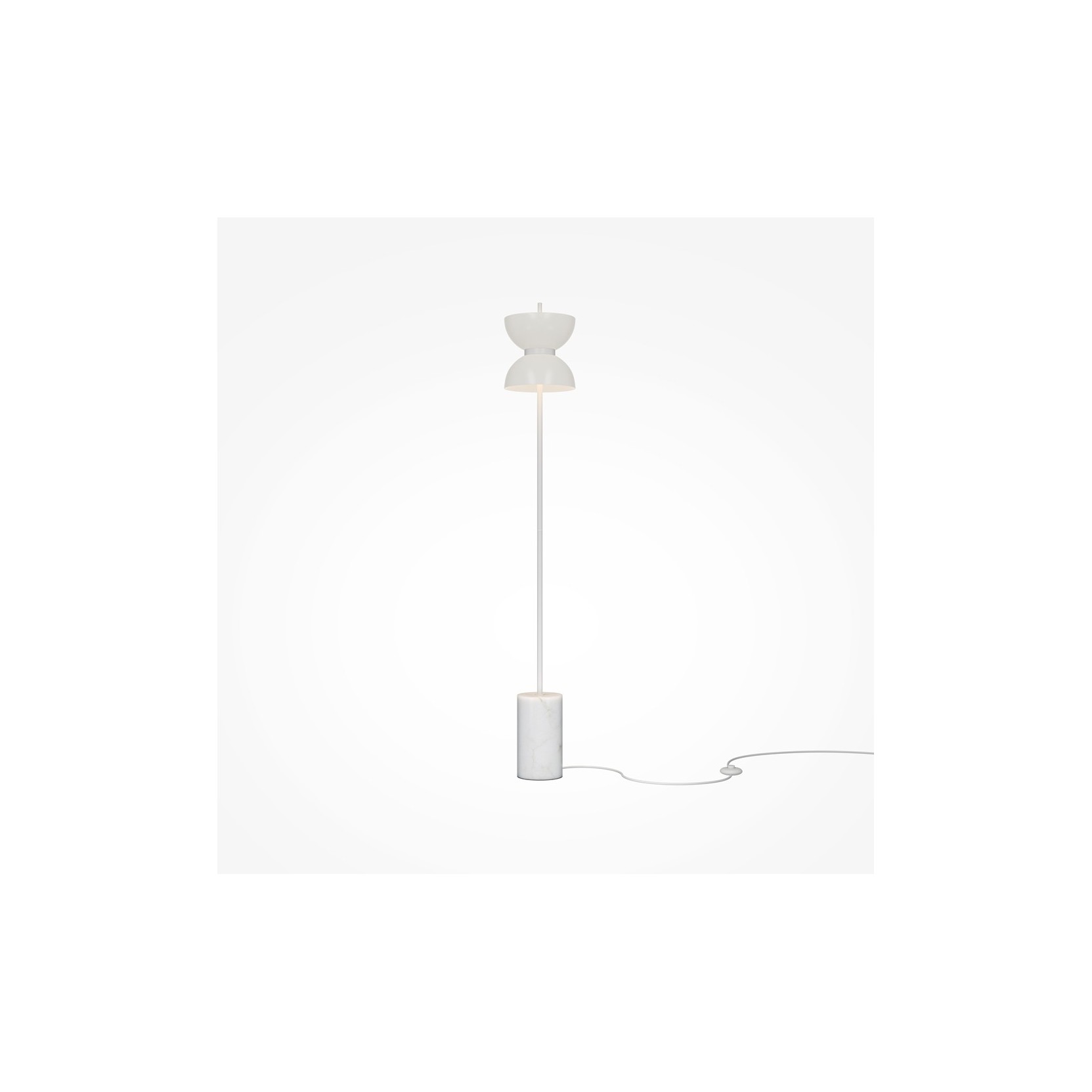 The Kyoto lamp stands out for its slender design and the refined combination of materials. The structure rises from a solid cylindrical base in veined marble, providing stability and a touch of contemporary classicism. The slender satin gold stem culminates in a double opposed-dome diffuser, creating a silhouette reminiscent of a luminous hourglass or a stylized flower.