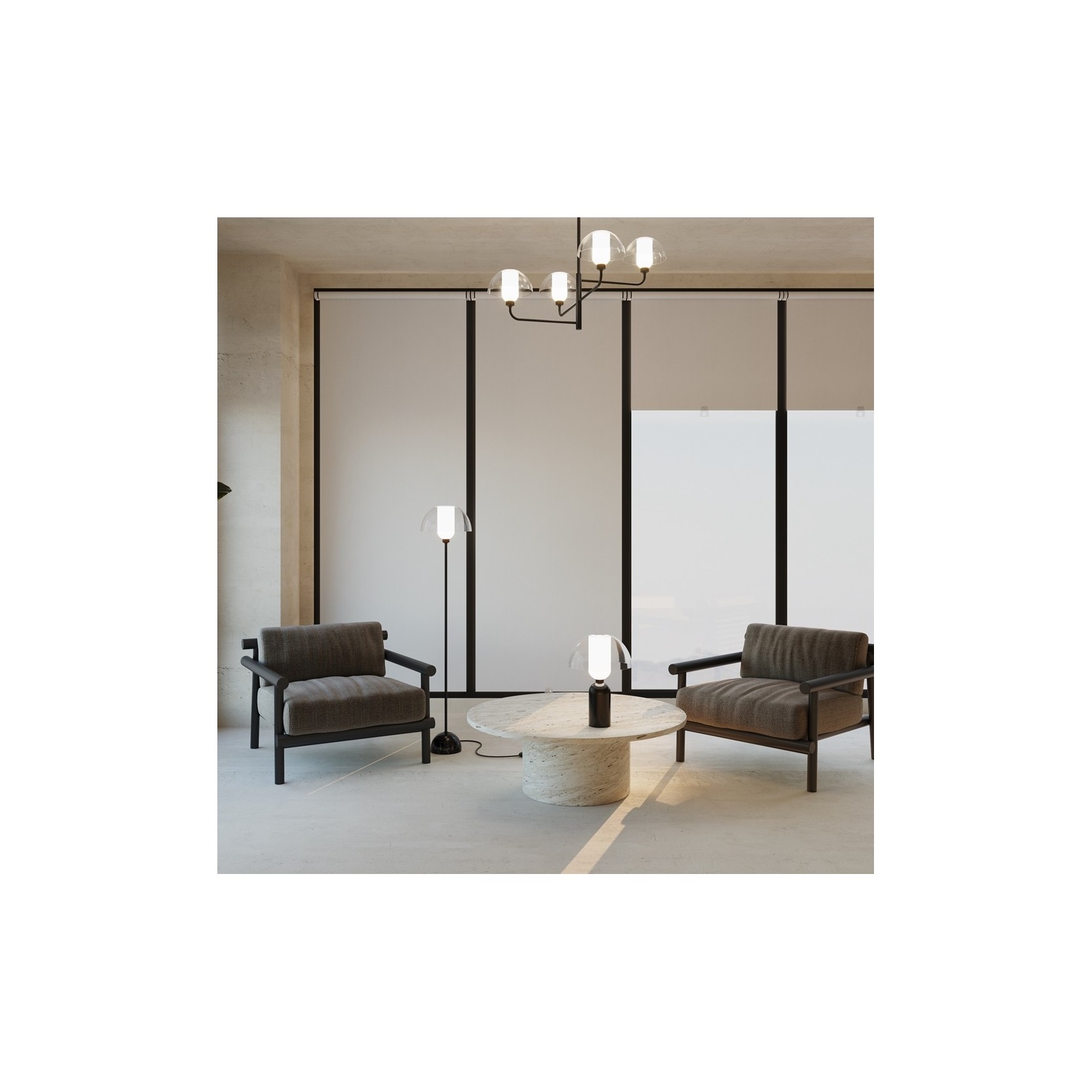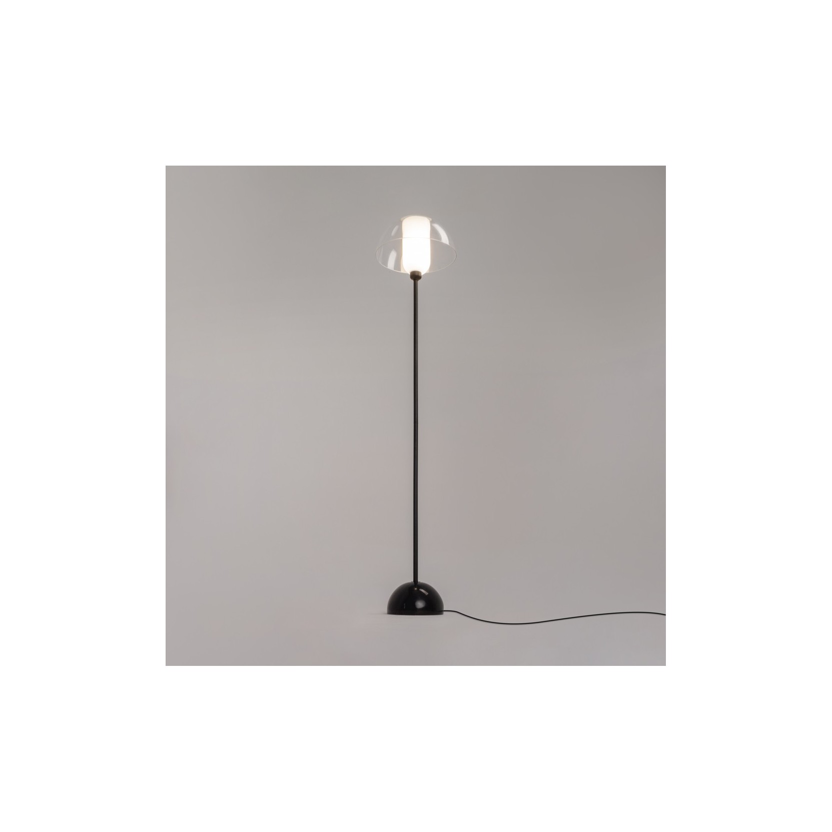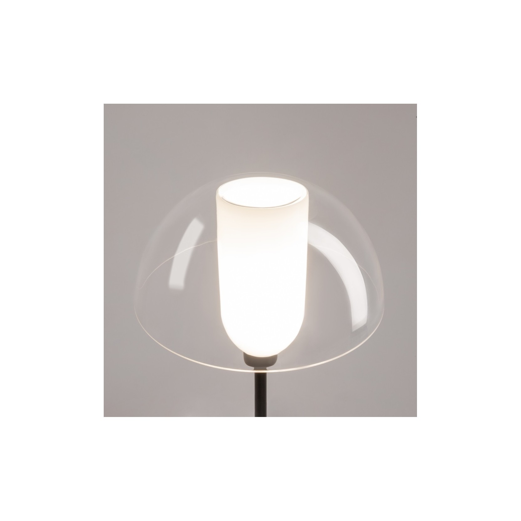 The Memory lamp stands out for its extremely slender and clean silhouette. The structure is composed of a slim matte black metal stem rising from a solid and stable coordinated hemispherical base. The true protagonist is the lighting body: a cylindrical white opal glass diffuser emitting a soft, uniform light, encased in a protective blown transparent glass shell. This combination creates a "modern lantern" effect, where the light appears to float in mid-air, protected by a crystalline bubble.