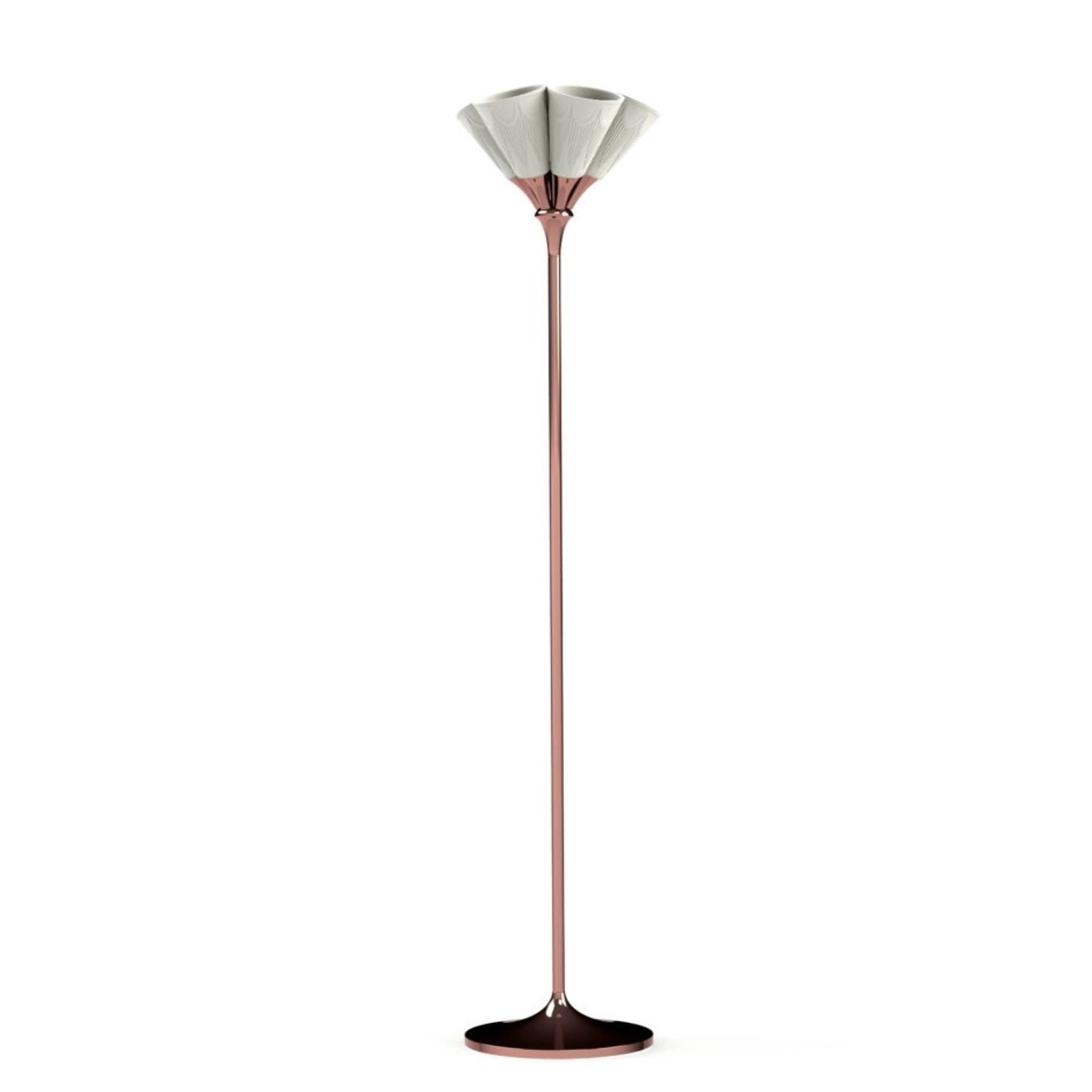 The Jamz collection has all the flavor of an era: the sound of jazz clubs, the forms inspired by art deco and the aroma of creativity, rhythm and vitality that have characterized some years of great personality. A unique selection of hanging, floor and reading lamps. The combination of brass lithophile and porcelain, with a choice of three different models, recalls the shape of jazz instruments. The customization of the lamps symbolizes the free essence of this music, allowing improvisation for custom creations. Refined lamps in white porcelain with gold, copper or black metals in which light and craftsmanship blend to create different atmospheres.