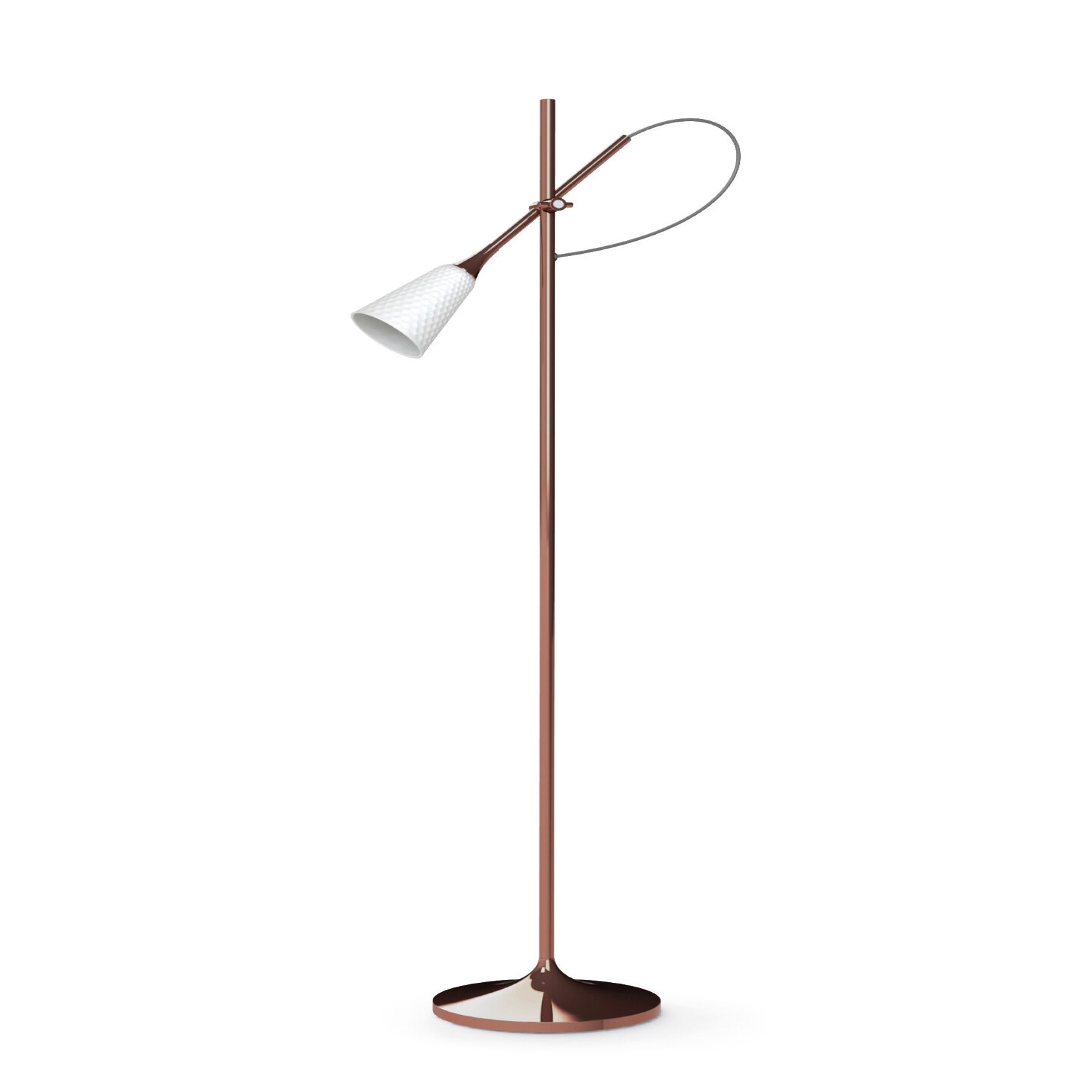 A floor lamp created by a combination of white porcelain and brass elements with three different gold, black nickel and copper finishes. The lampshades are available in various motifs to customize the lamp. The variations express the spirit of a collection permeated by the freedom and improvisation of jazz. Handmade in Spain.