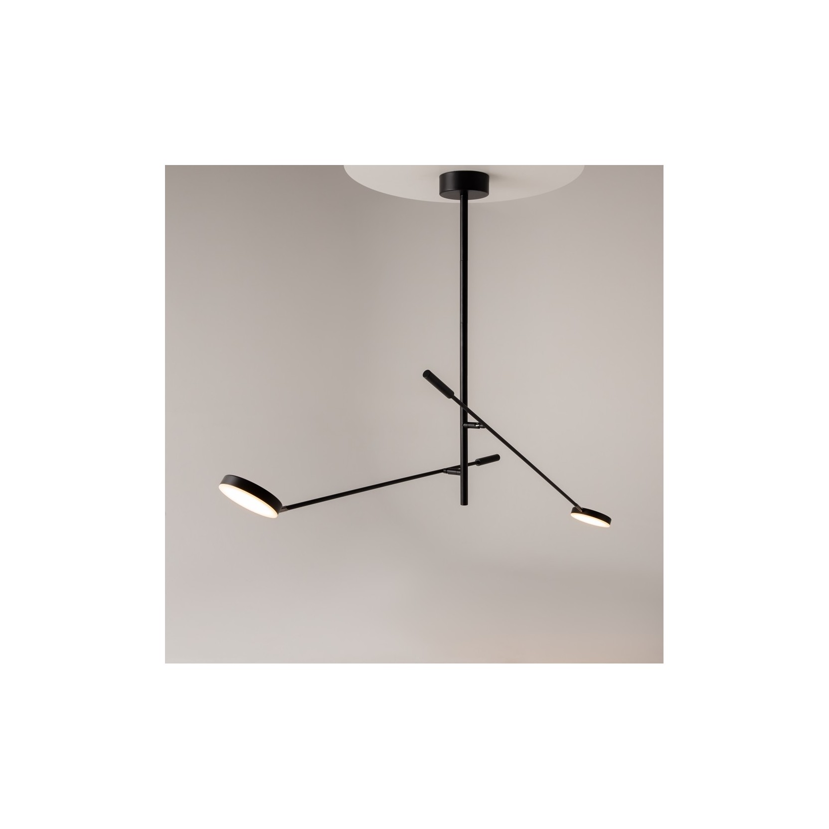 The FAD celing lamp is presented with cylindrical diffusers that rotate at 340, in horizontal plane and at 90, in vertical plane. . The structure of the lamp is made of metal with black acrylic. Looking at the lamp you have the impression of looking at a disc that hovers in the ceiling of the house.
