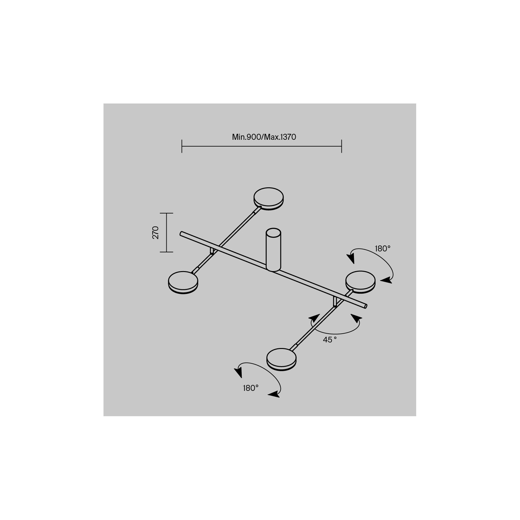The Fad ceiling light redefines overhead lighting through a radial geometric structure. Featuring a solid black central rod from which horizontal arms of varying lengths branch out, this lamp is designed to distribute light evenly over large surfaces, eliminating shadows and creating a visual aesthetic of great lightness.