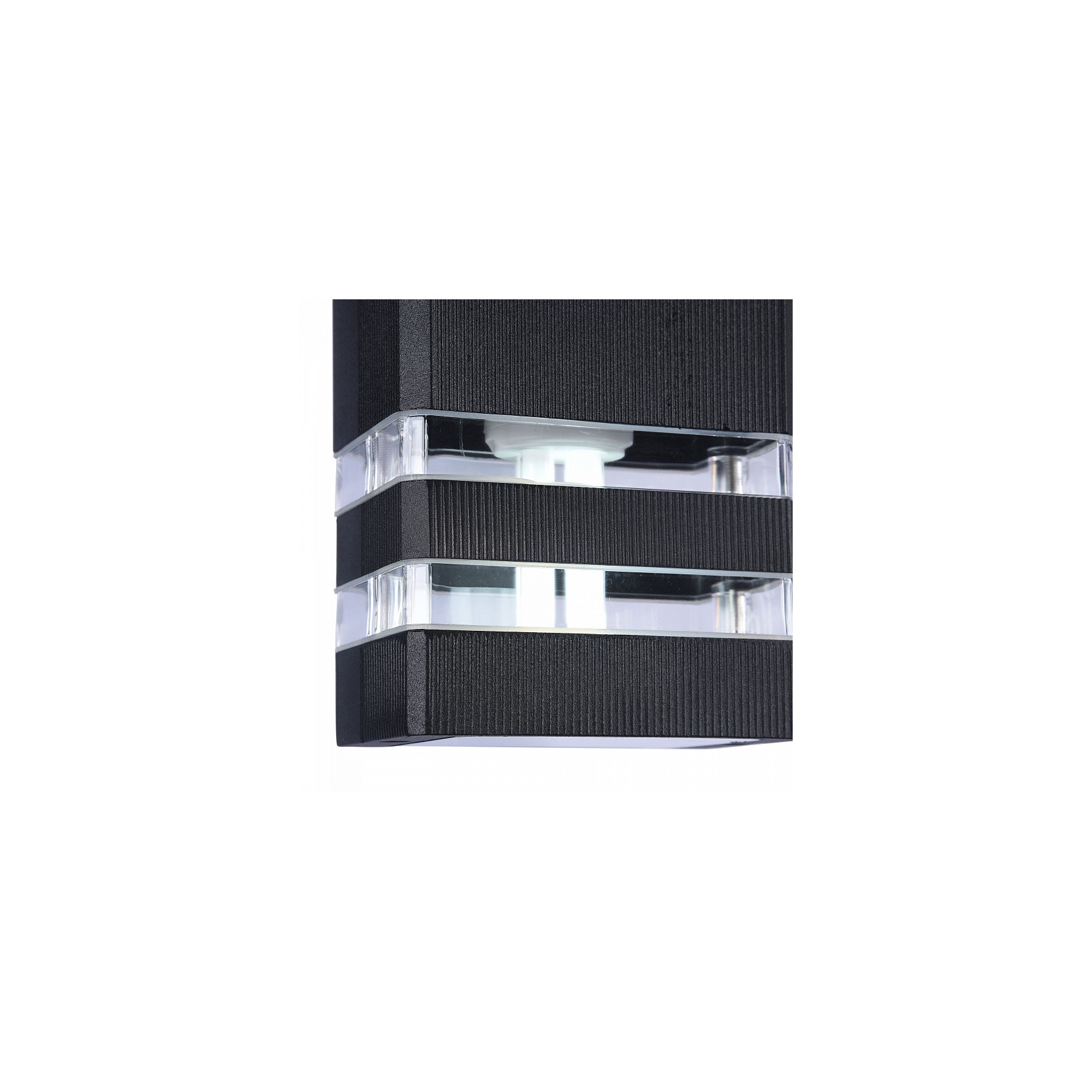 The outdoor wall lamp Unter den Linden consists of a metal frame with transparent plastic inserts in the diffuser both at the top and bottom. The structure consists of a decorated striped pattern. Unter den Linden is resistant to temperature changes and corrosion.