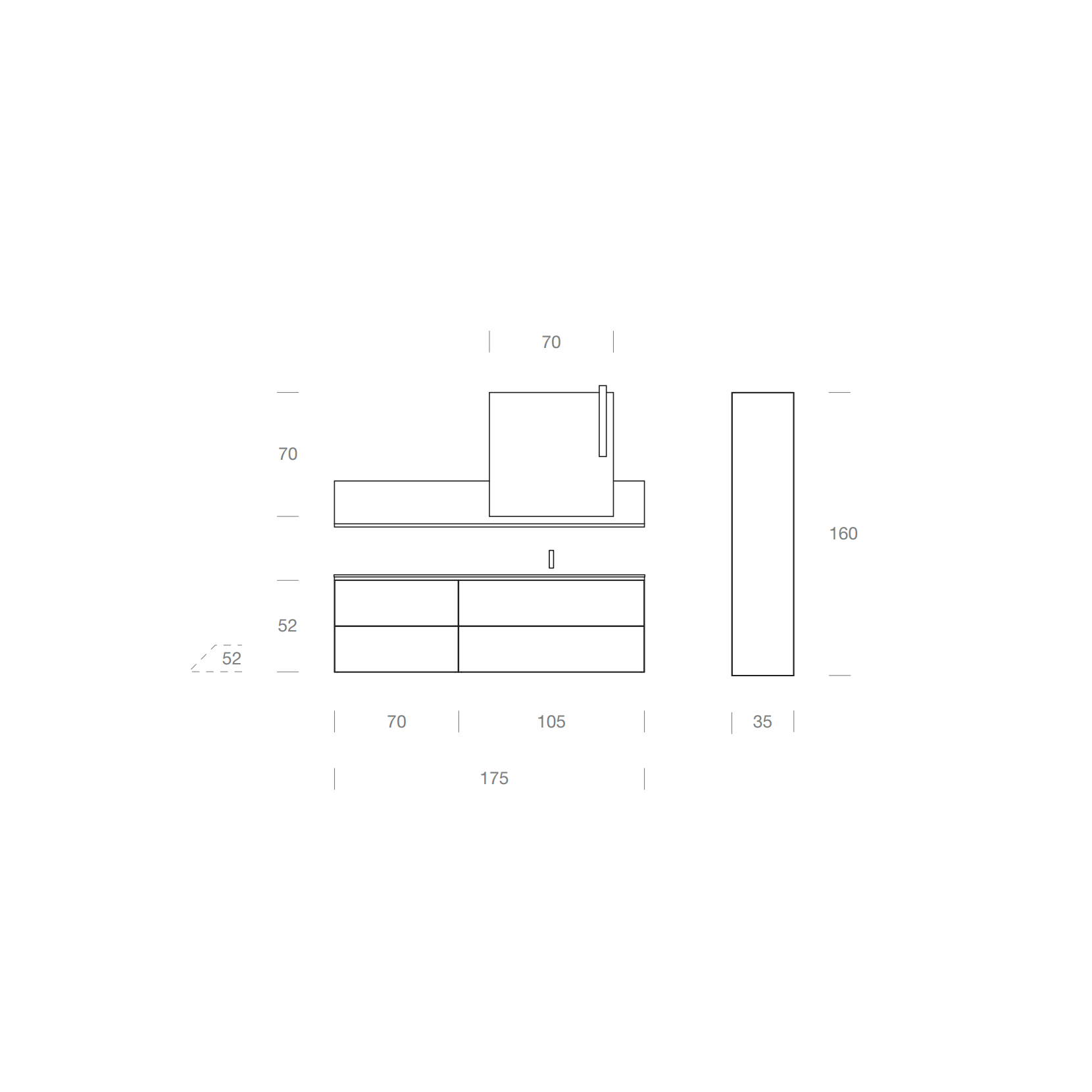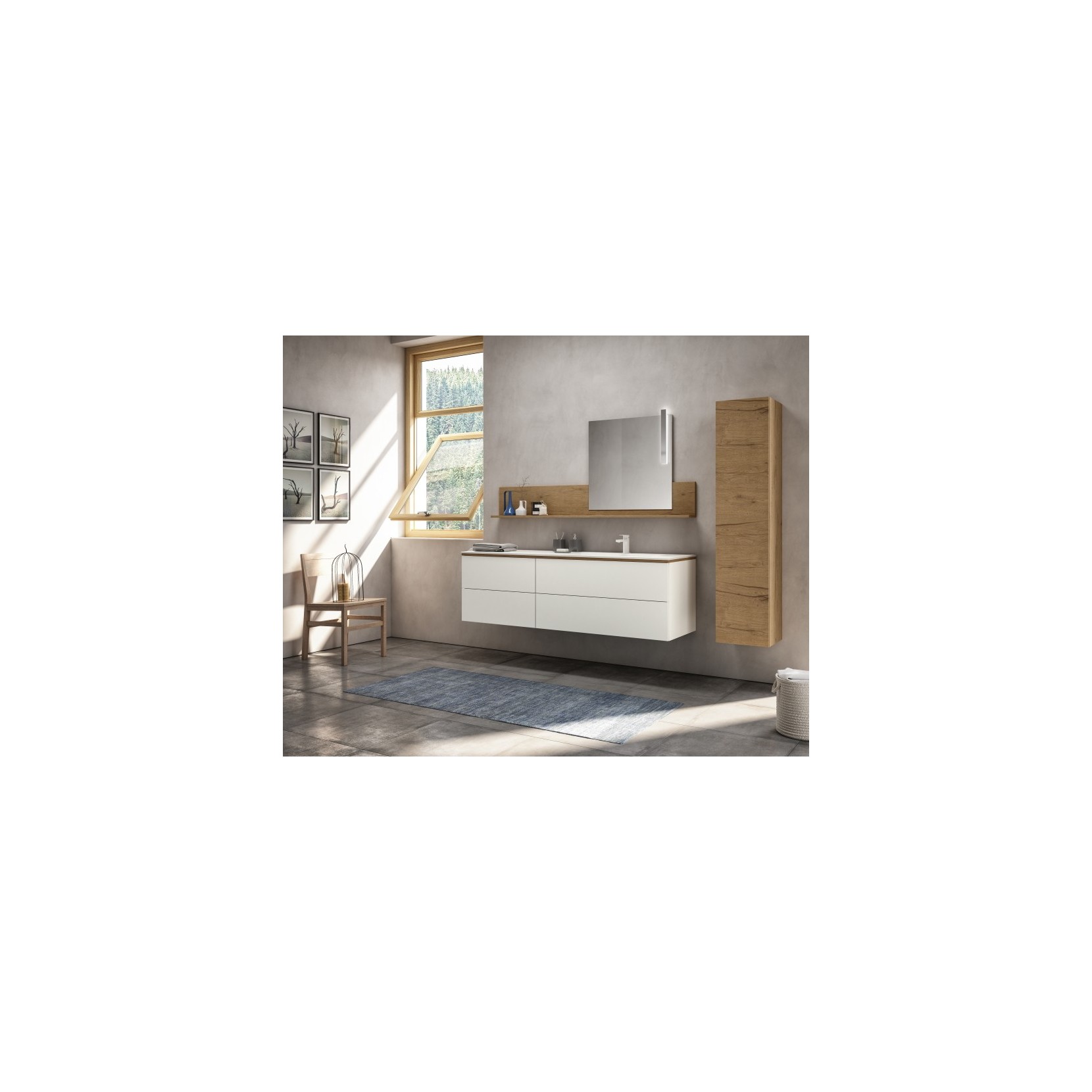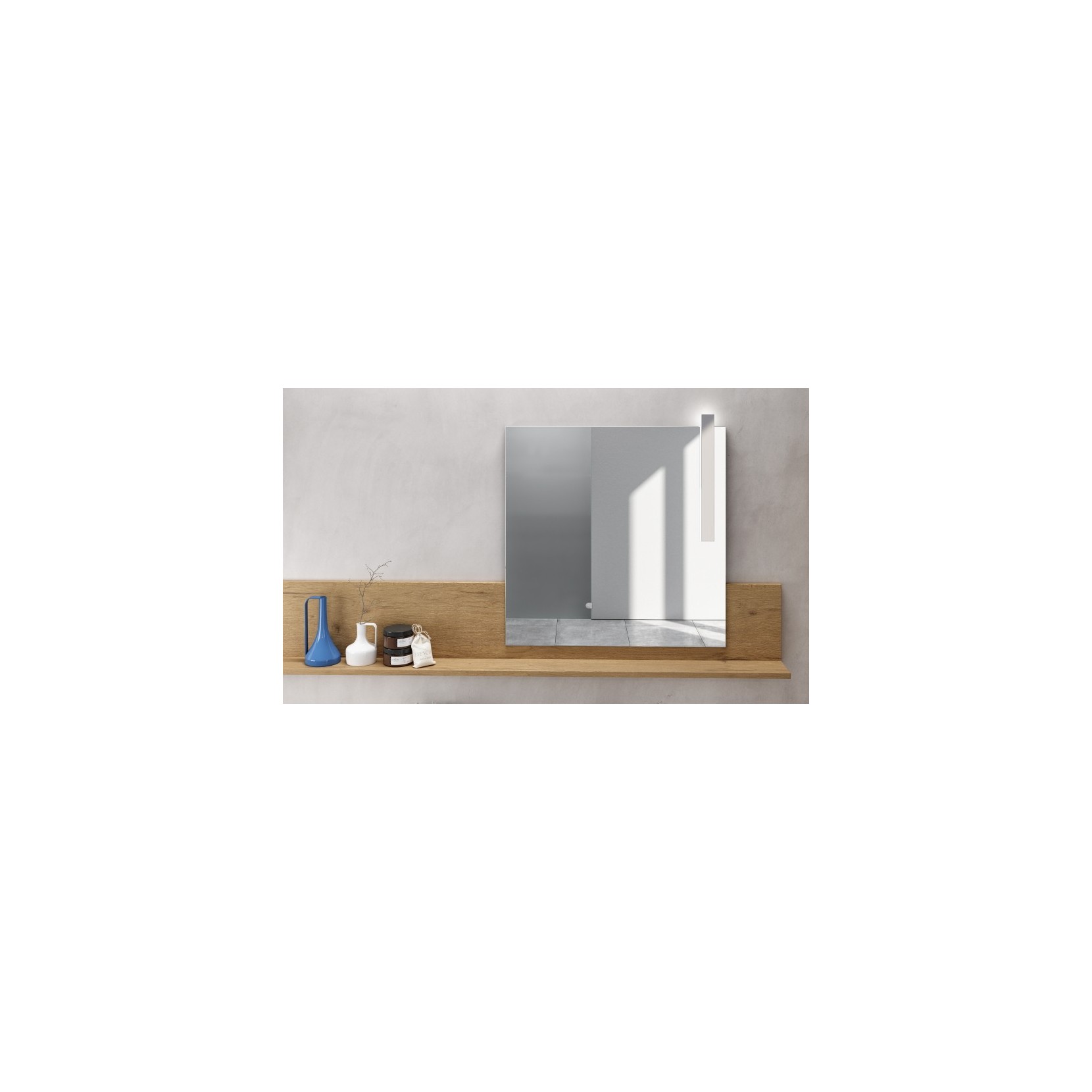 Mirror Slide with shelf in 961 Nativo Cotto wood finish and City lamp. Column in 961 Nativo Cotto wood finish with metal integrated pull in white matt lacquered.