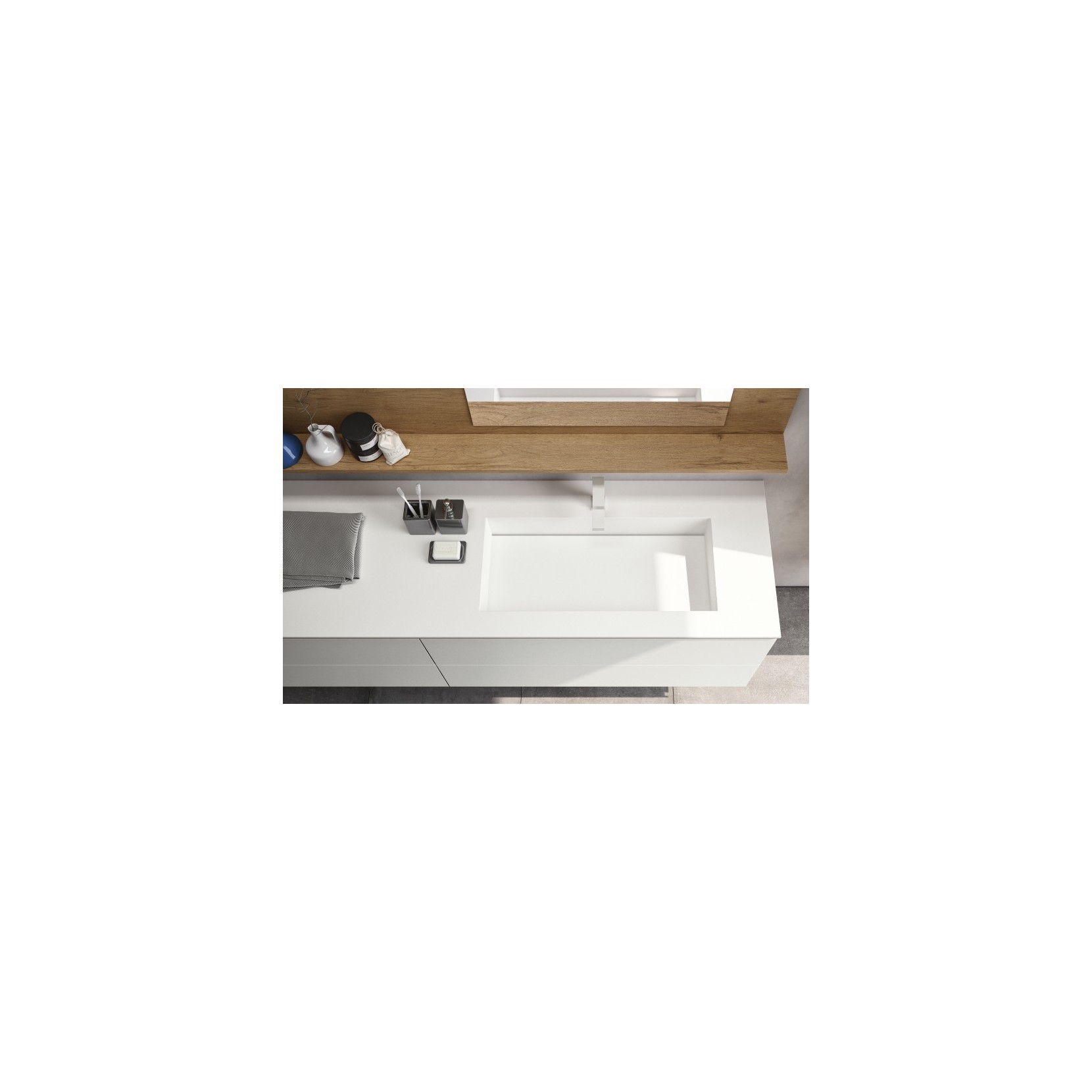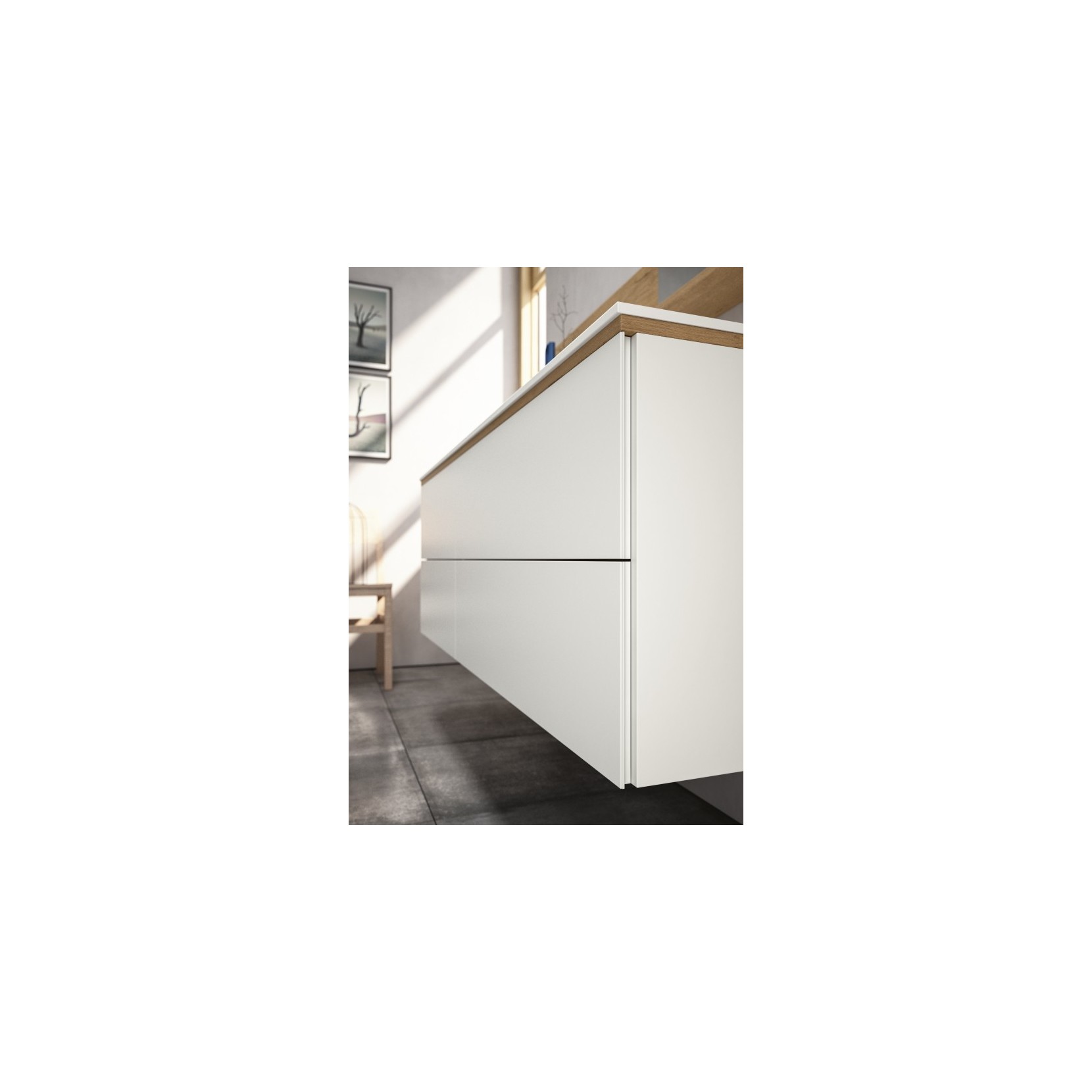 Base elements in 017 Latte matt lacquered with underneath top in 961 Nativo Cotto wood finish; white Tecnolite top.
