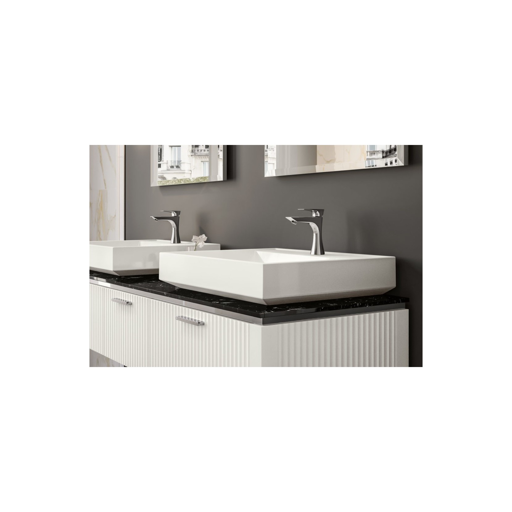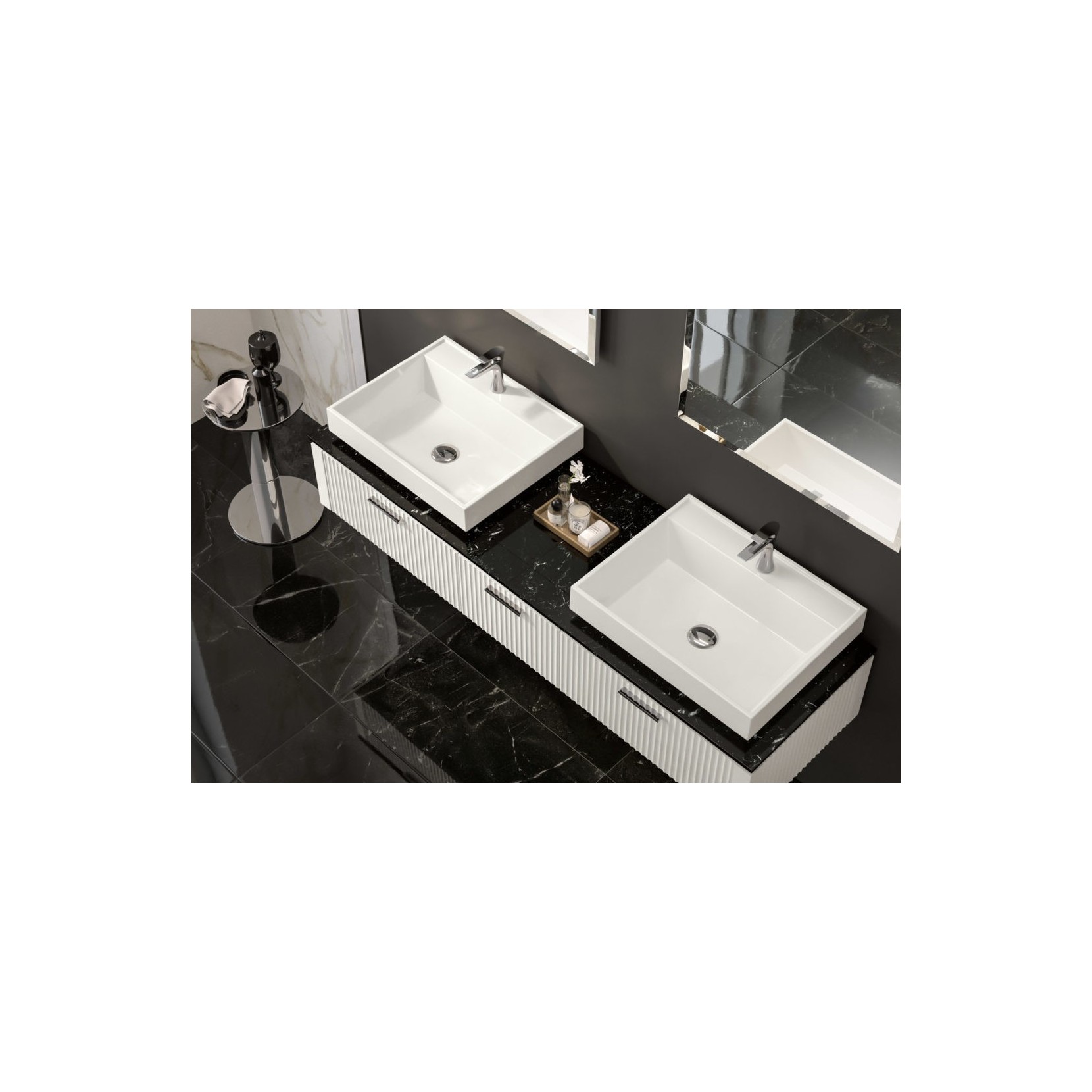 Wash-basin base unit, front and side covers Gessato 017 Latte matt. Marble top Nero Tarquinia.