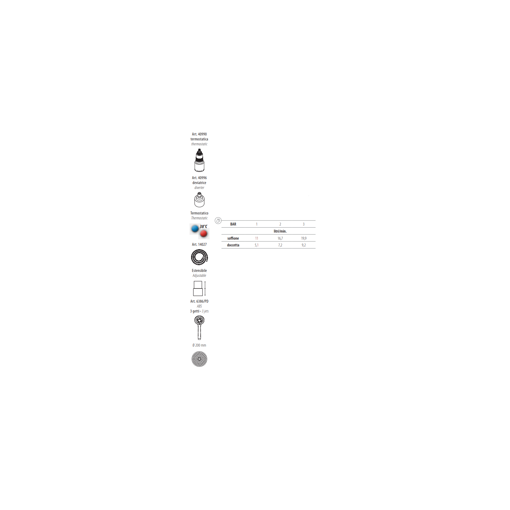 Brass external thermostatic mixer, adjustable shower column with anti-limestone shower head Ø 200 mm and 3 jets hand-shower