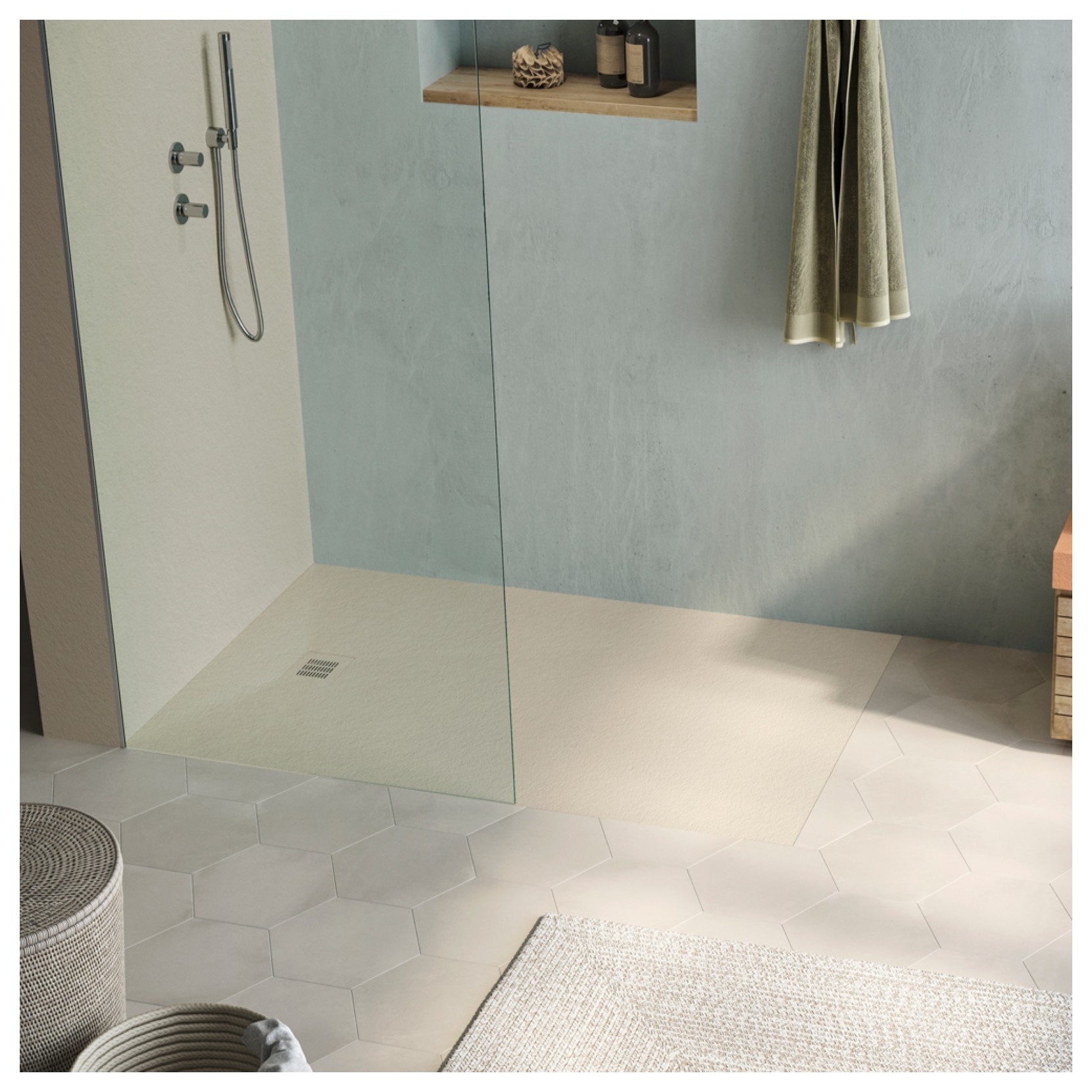 The ONE collection is one of the most versatile, able to adapt to any style of bathroom thanks to its essential lines. One with stainless steel grid is made of Kromat with slate texture or Microtex available in six different basic standard colors.