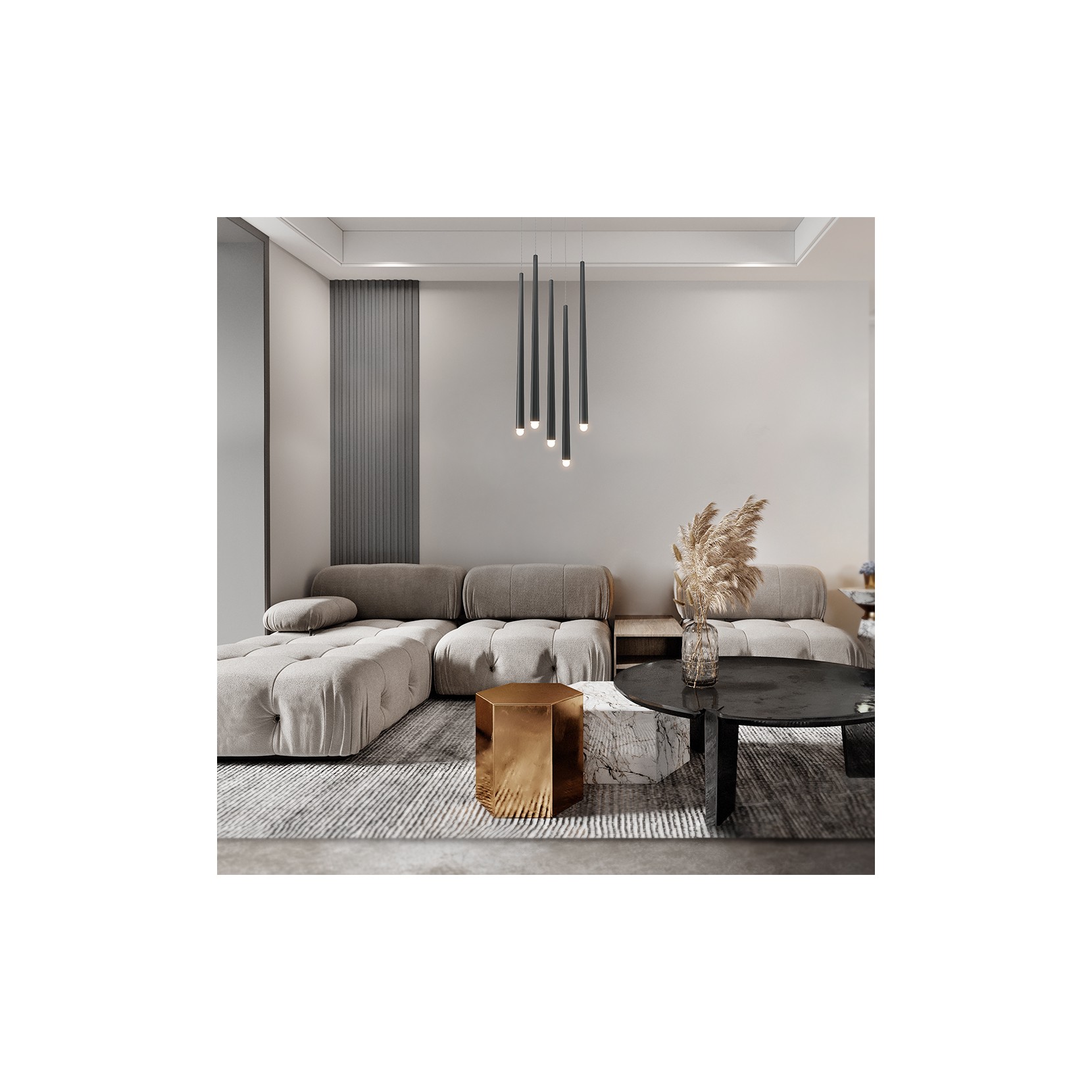 Available in two finishes: black and brass, it has an aluminium structure with a minimalist and linear design.
