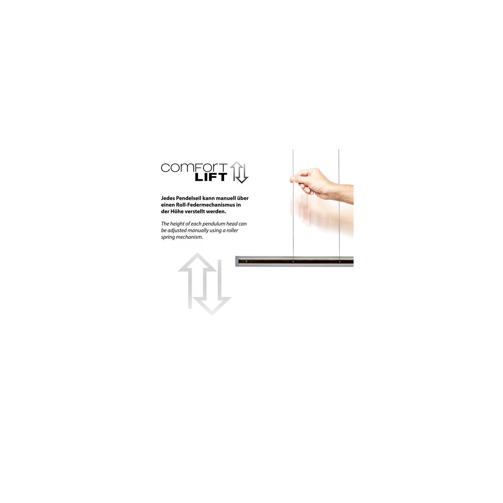 Autre atout : le système Up-and-Down-Light, qui éclaire à la fois vers le bas et vers le haut, assurant une répartition harmonieuse de la lumière. Avec le mécanisme Comfort Lift, la hauteur de la suspension peut être ajustée en toute simplicité et de manière continue, idéale pour s’adapter aux différentes hauteurs de table et aux besoins variés.