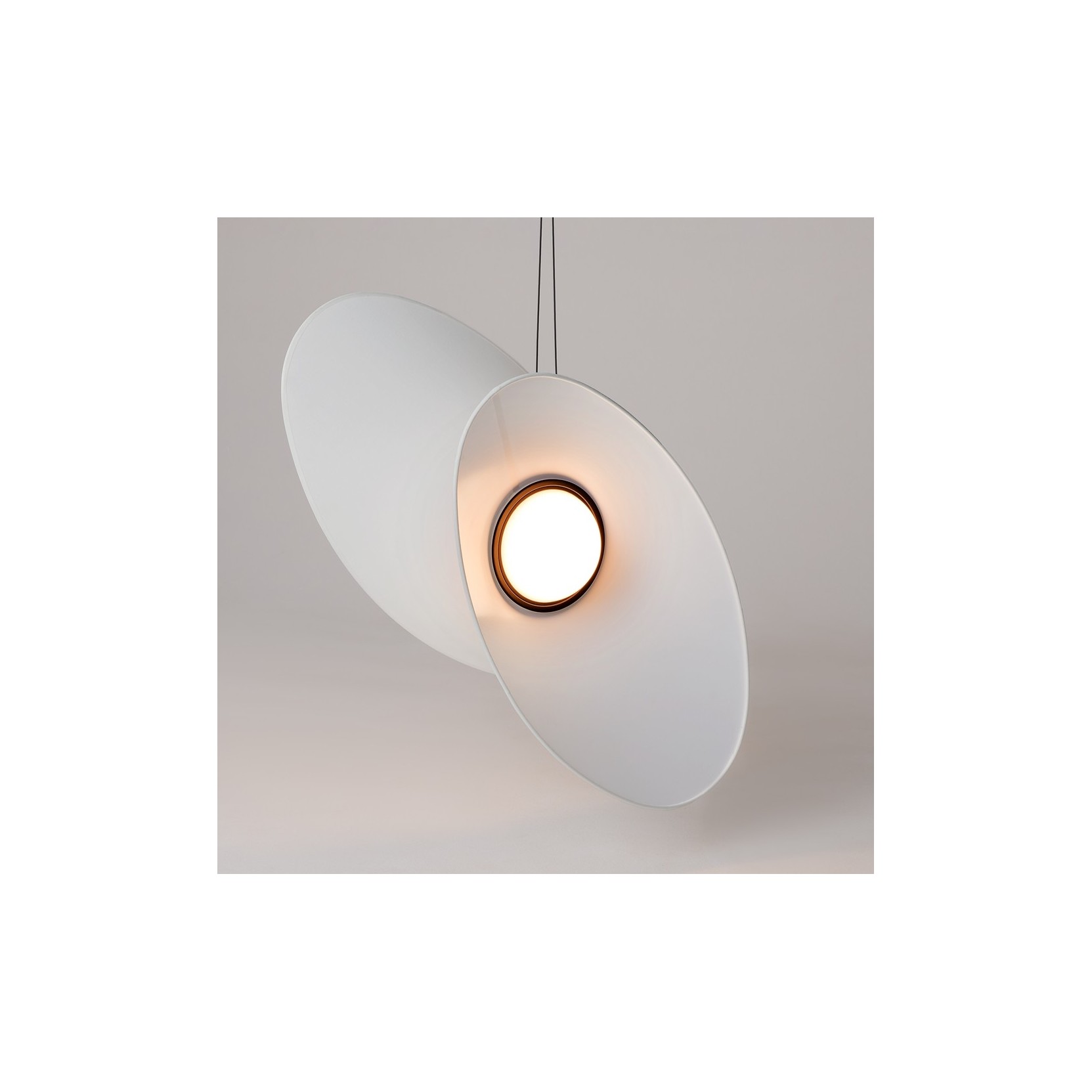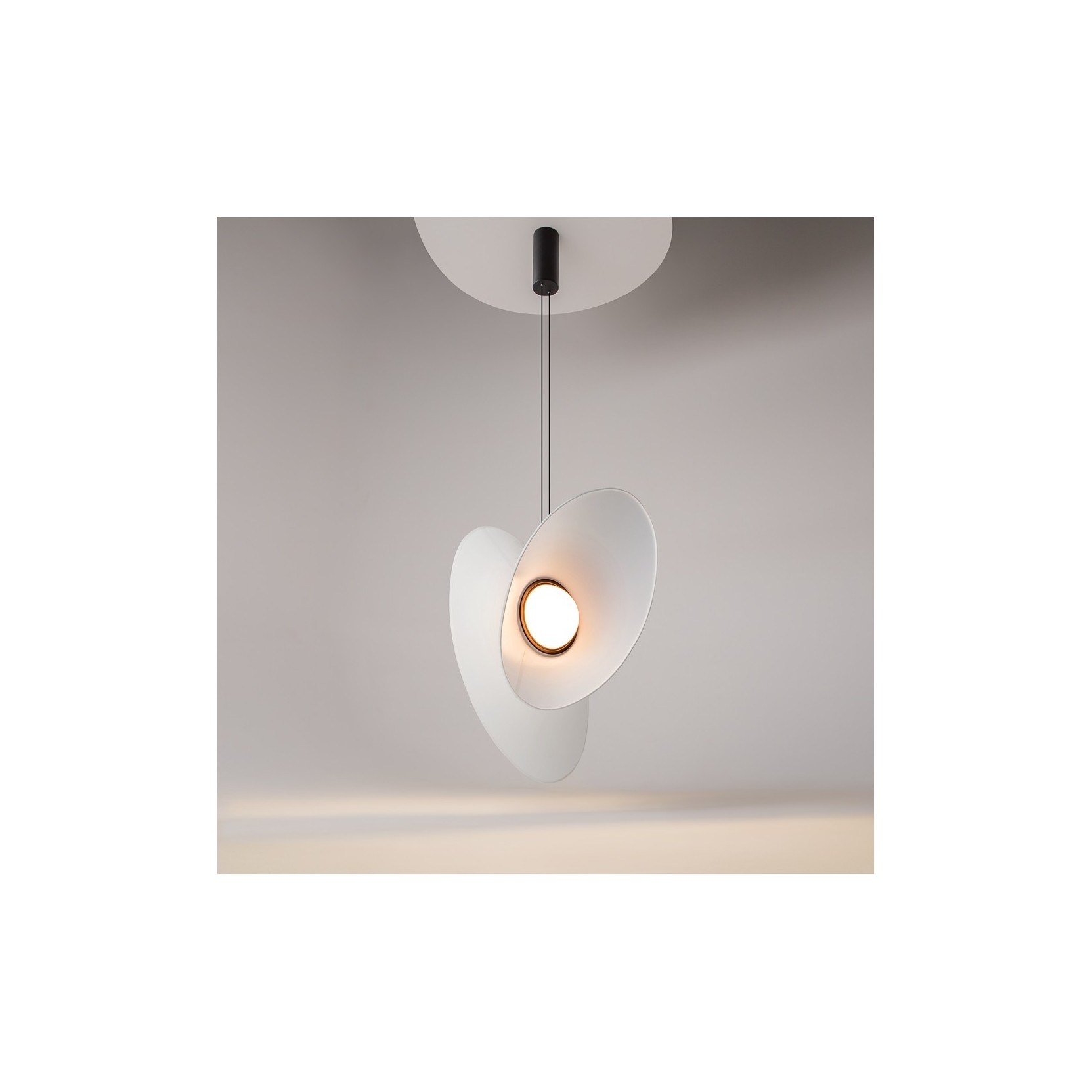 The Evolution pendant lamp is a minimalist work of art that plays with balance and the overlapping of shapes. Characterized by two asymmetric circular disks that seem to orbit around a central light source, this lamp creates a dynamic and sophisticated visual effect. It is the ideal solution for those seeking lighting that is simultaneously functional and sculptural.