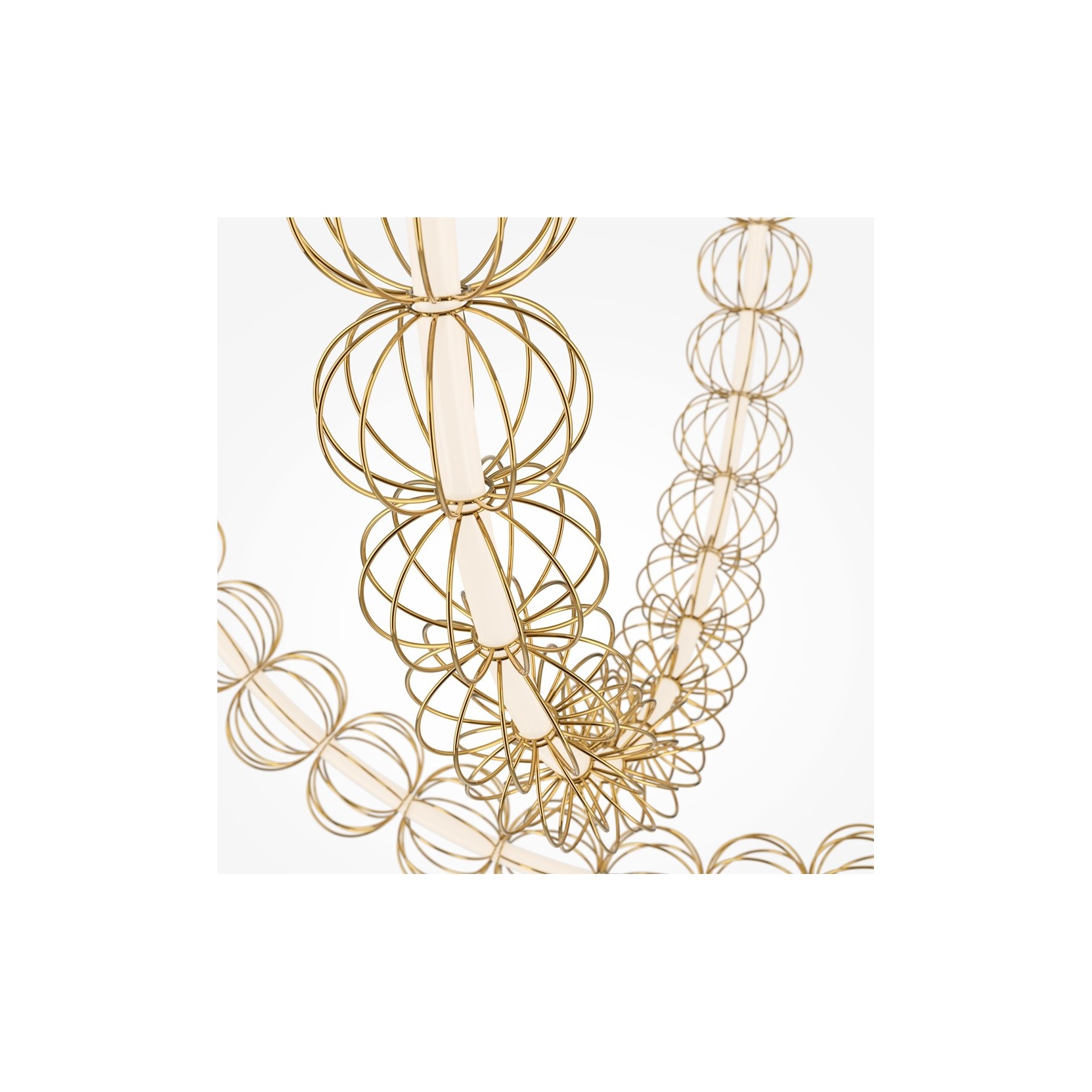 The Golden Cage lamp stands out for its asymmetrical and sculptural composition. A slender black rod supports a white disk and a cylindrical light source, positioned in a seemingly precarious balance that immediately captures the eye. The structure is topped by a large upper disk that acts as a reflective canopy, creating a sophisticated play of proportions and shadows.