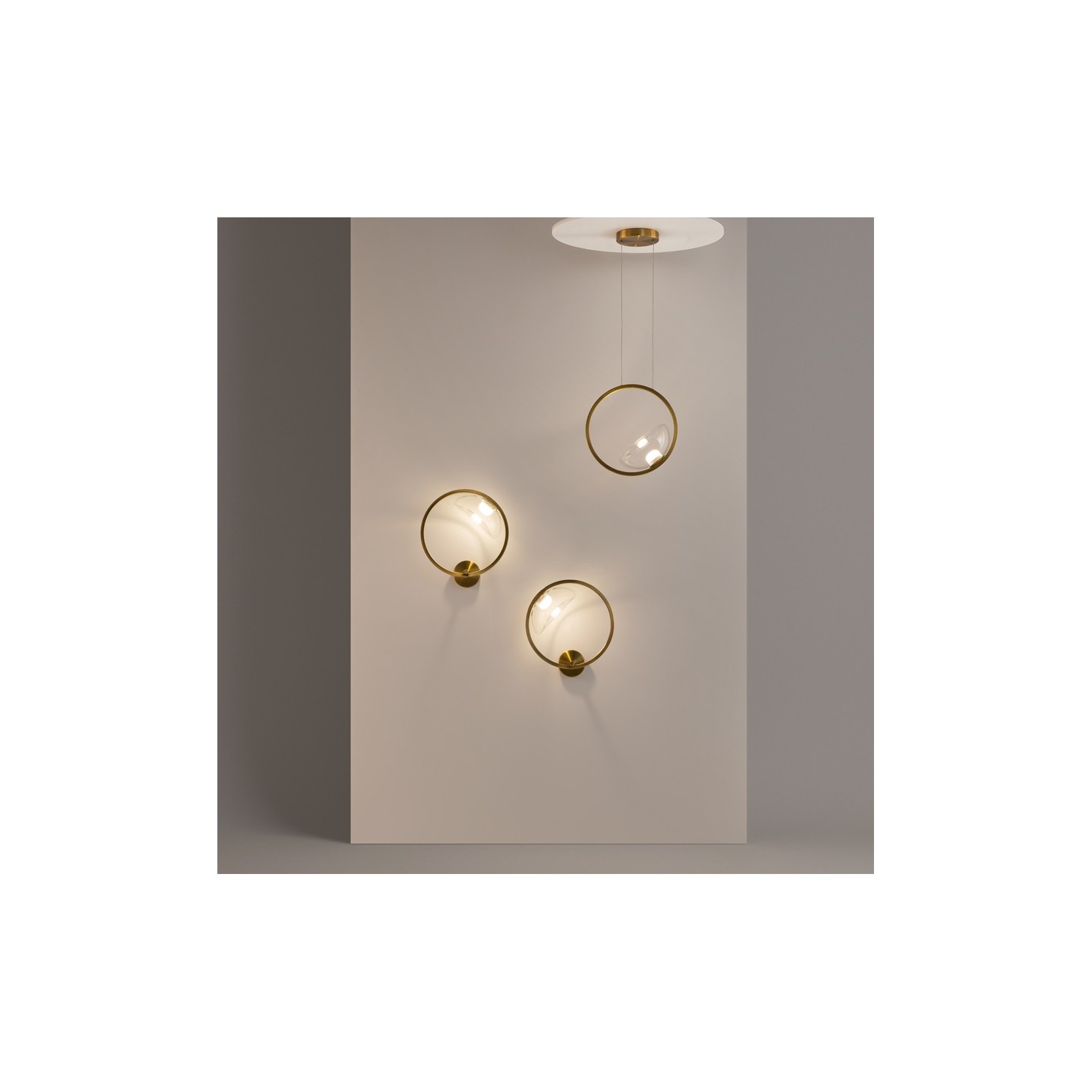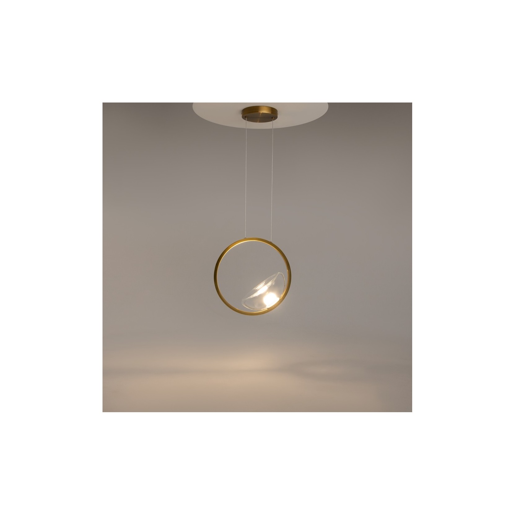 The Lunare lamp stands out for its sculptural and asymmetrical structure. Featuring a slender central stem in a satin gold finish, the lamp supports a horizontal rod that seems to float in mid-air. At one end, we find a perfect luminous circle (a LED ring), while the rod extends toward the opposite side, creating a sense of infinite expansion. This composition challenges the laws of statics, transforming a lighting fixture into a true modern art installation.