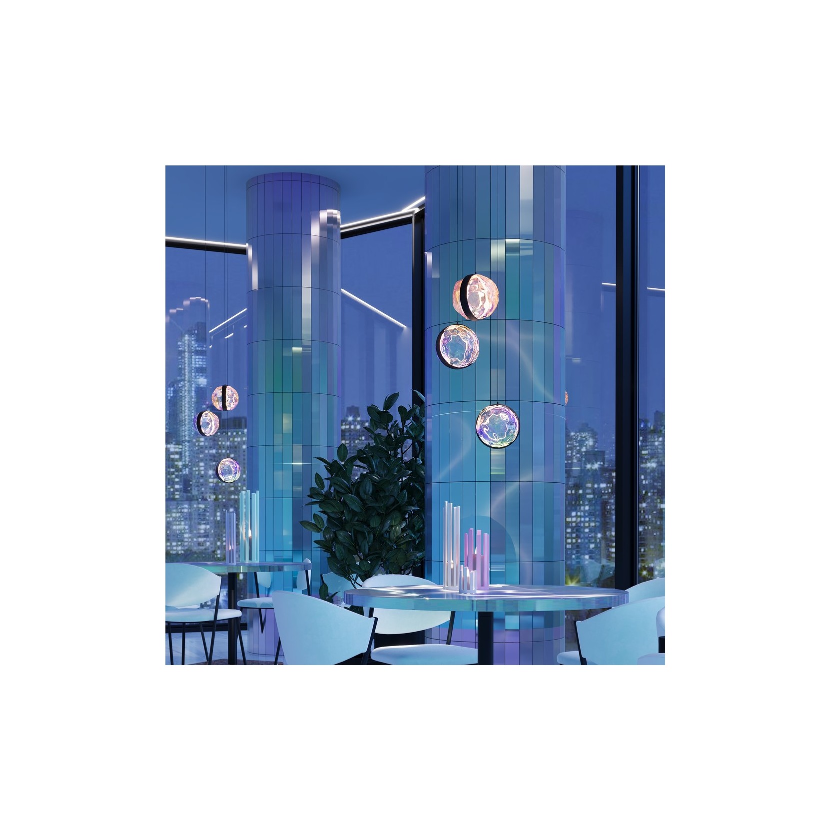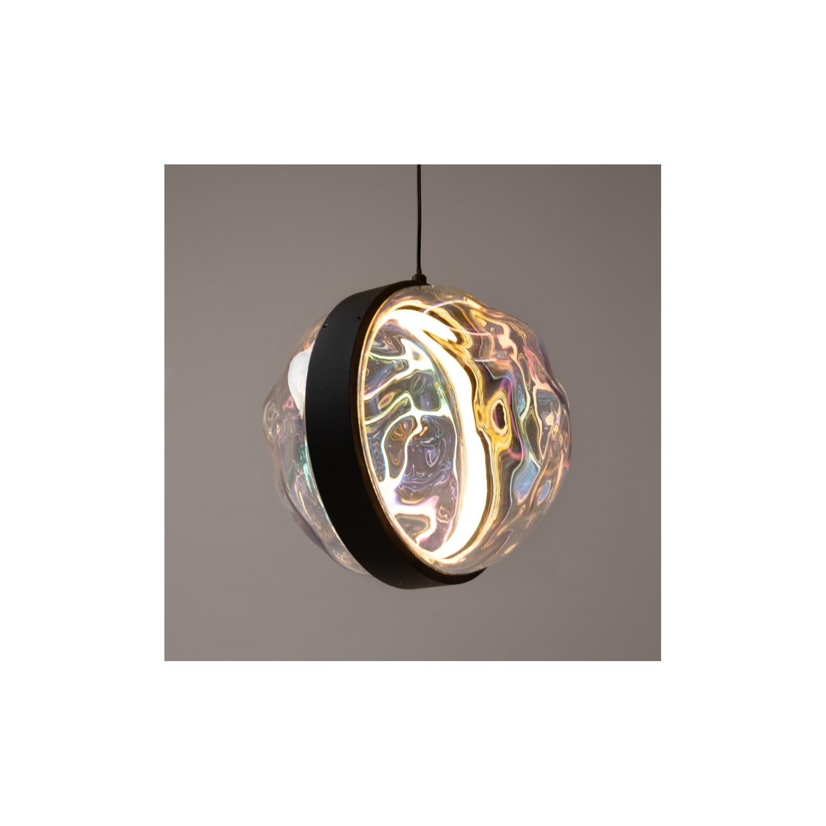 The lamp is composed of three hollow glass spheres with an organic and rippled texture, reminiscent of the surface of moving water or cosmic nebular formations. Each sphere is vertically intersected by a satin black metal ring that houses the integrated LED source, projecting light inward to emphasize every single facet and iridescence of the glass.