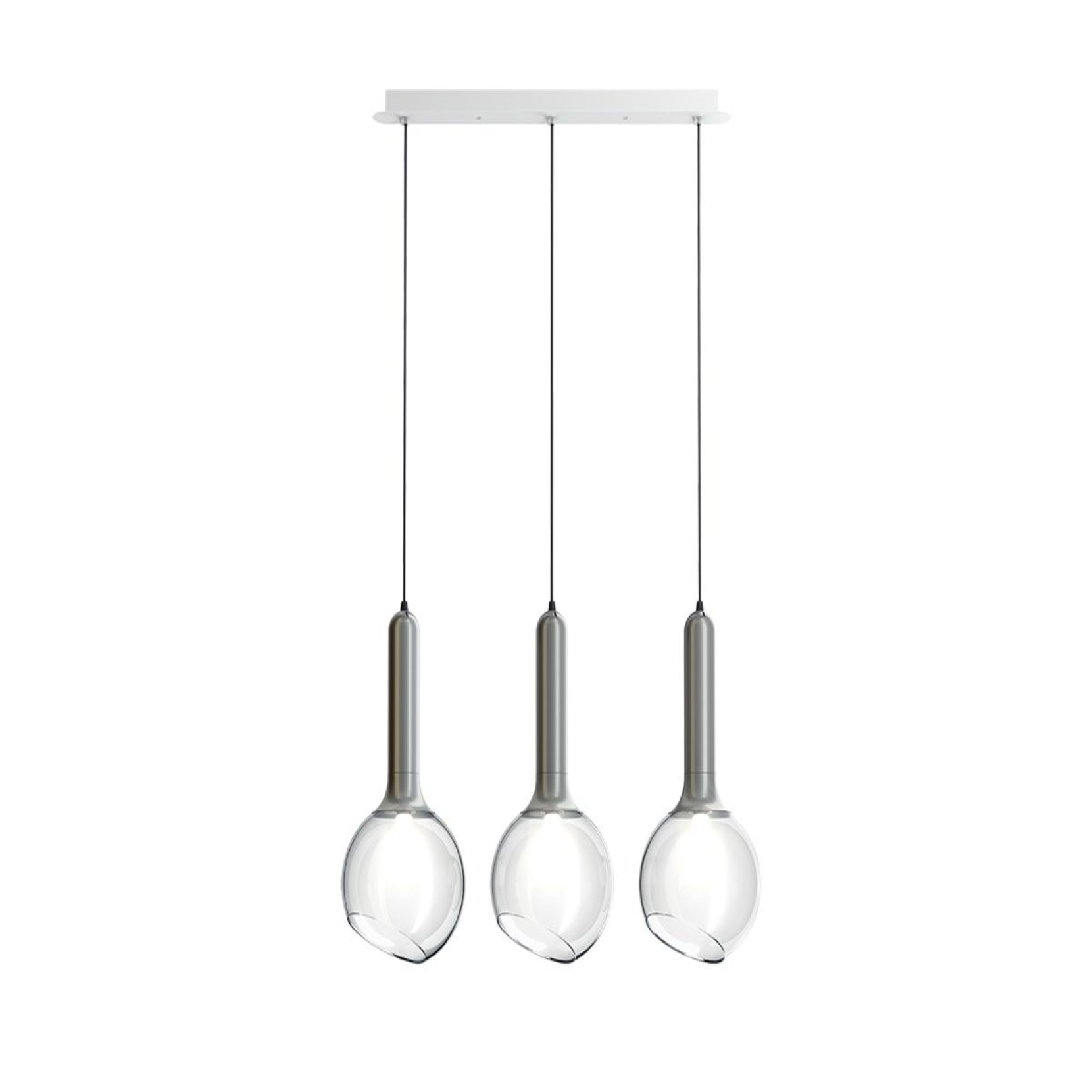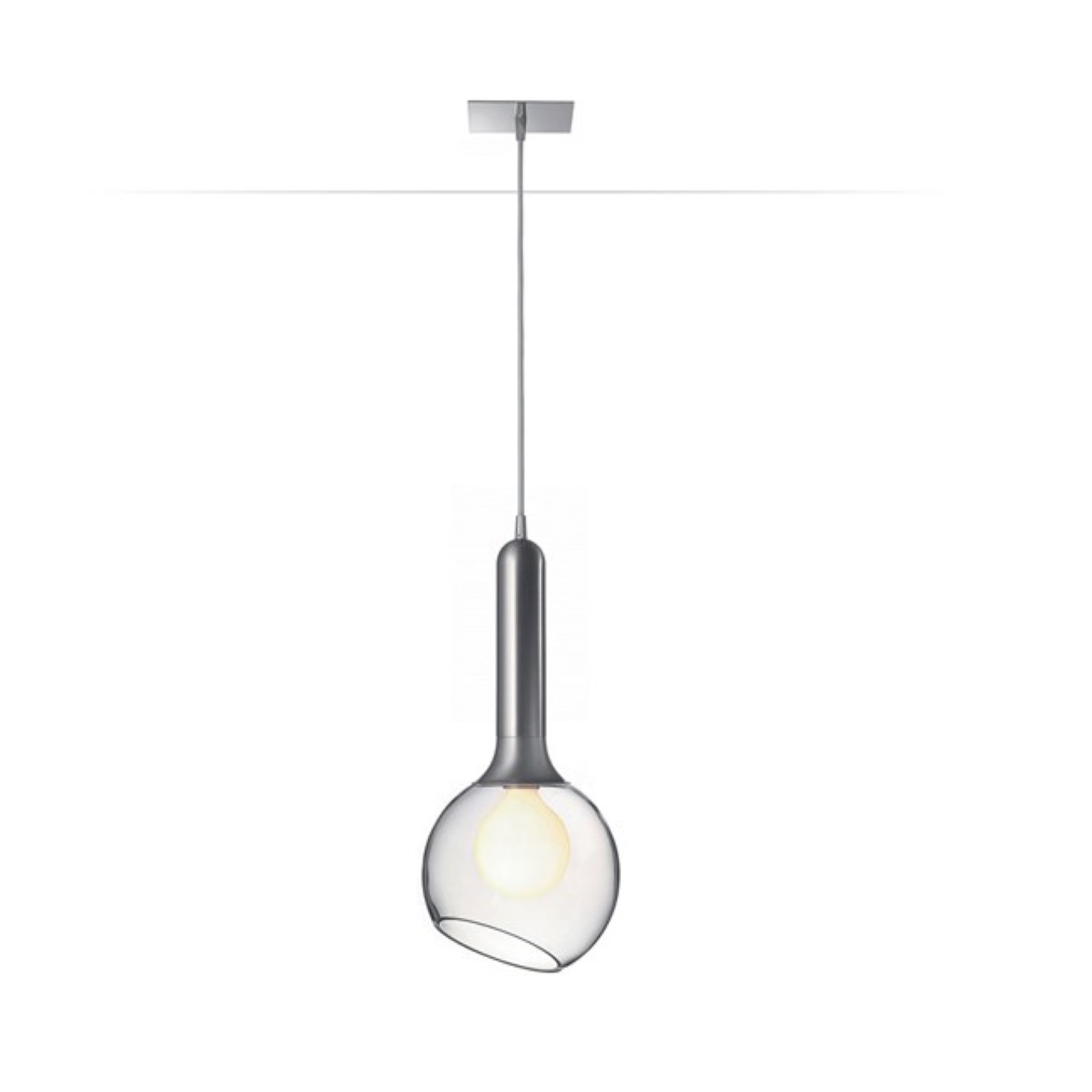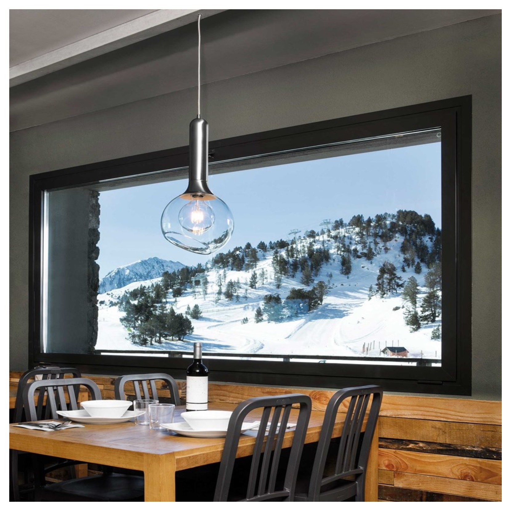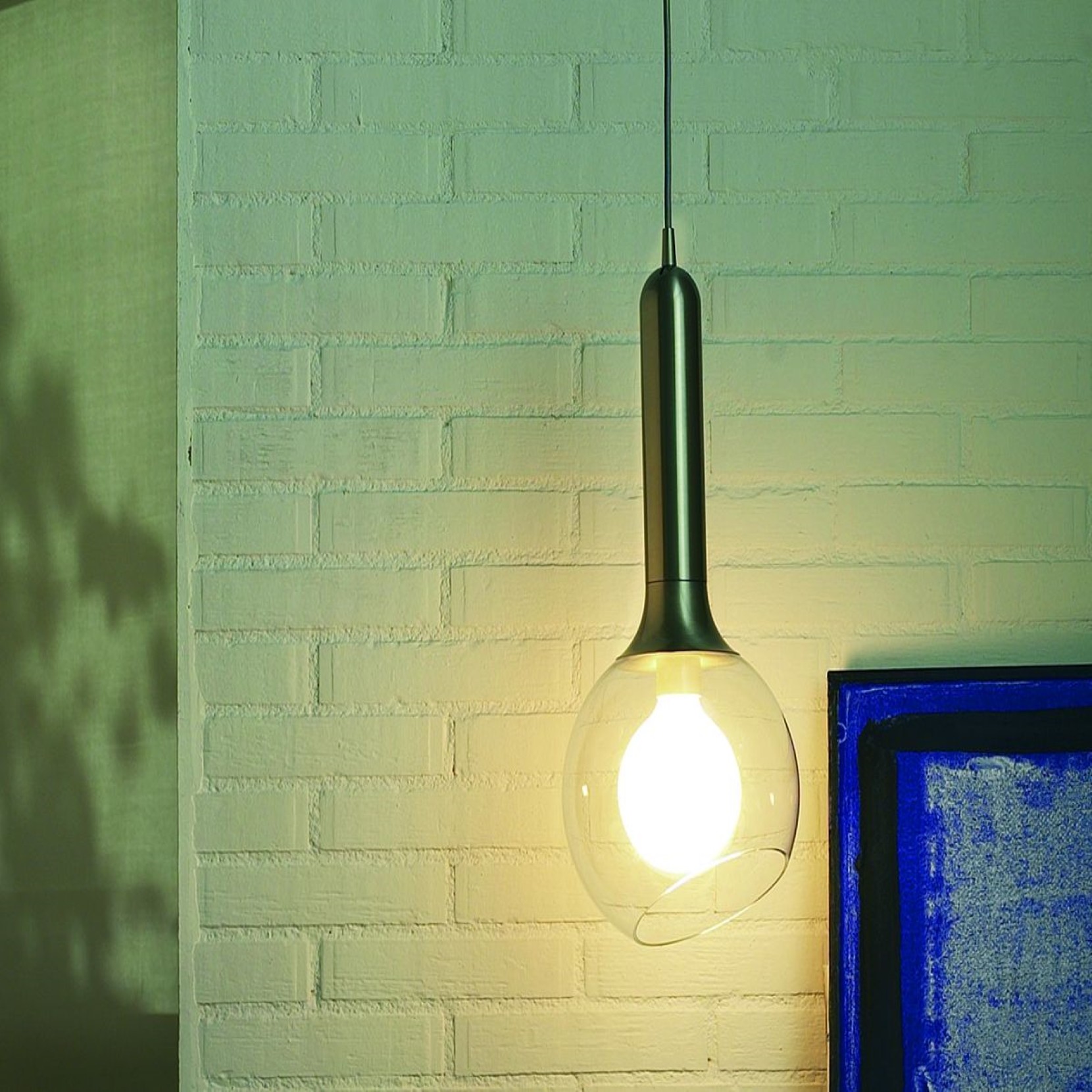 LUCK is a versatile collection, designed by Valencian designer Ximo Roca. The lamp has a bell-shaped metal structure in the center that contains a crystal ball. The bulb inside is completely visible, allowing white light to flow from all sides, giving the effect of an unfinished object thanks to the original cut in the base. Hanging lamp with direct and indirect light in transparent glass, diagonal opening on the bottom. The height is adjustable and can be used on sloped ceilings.