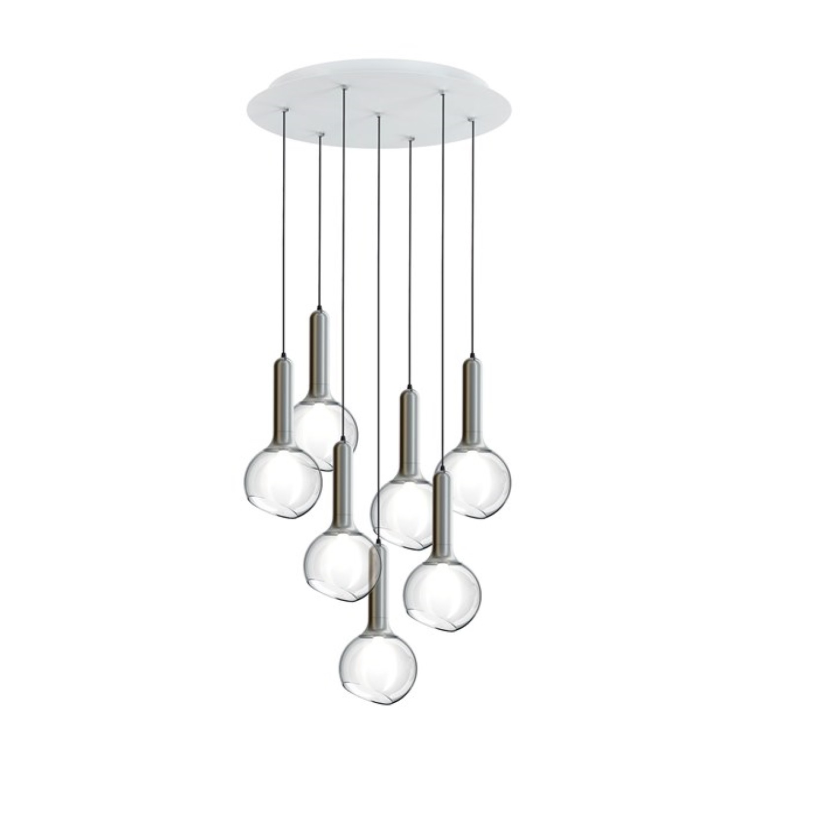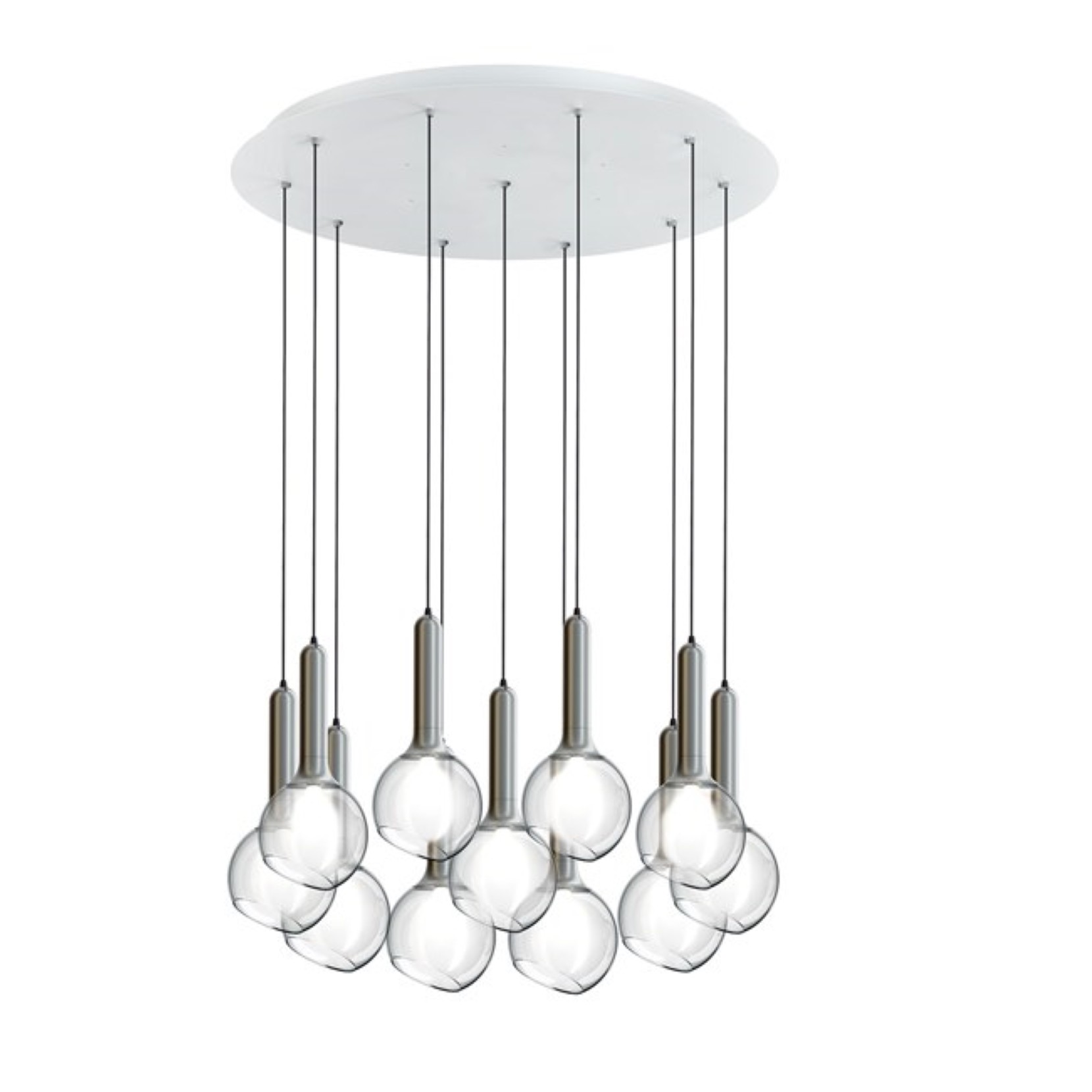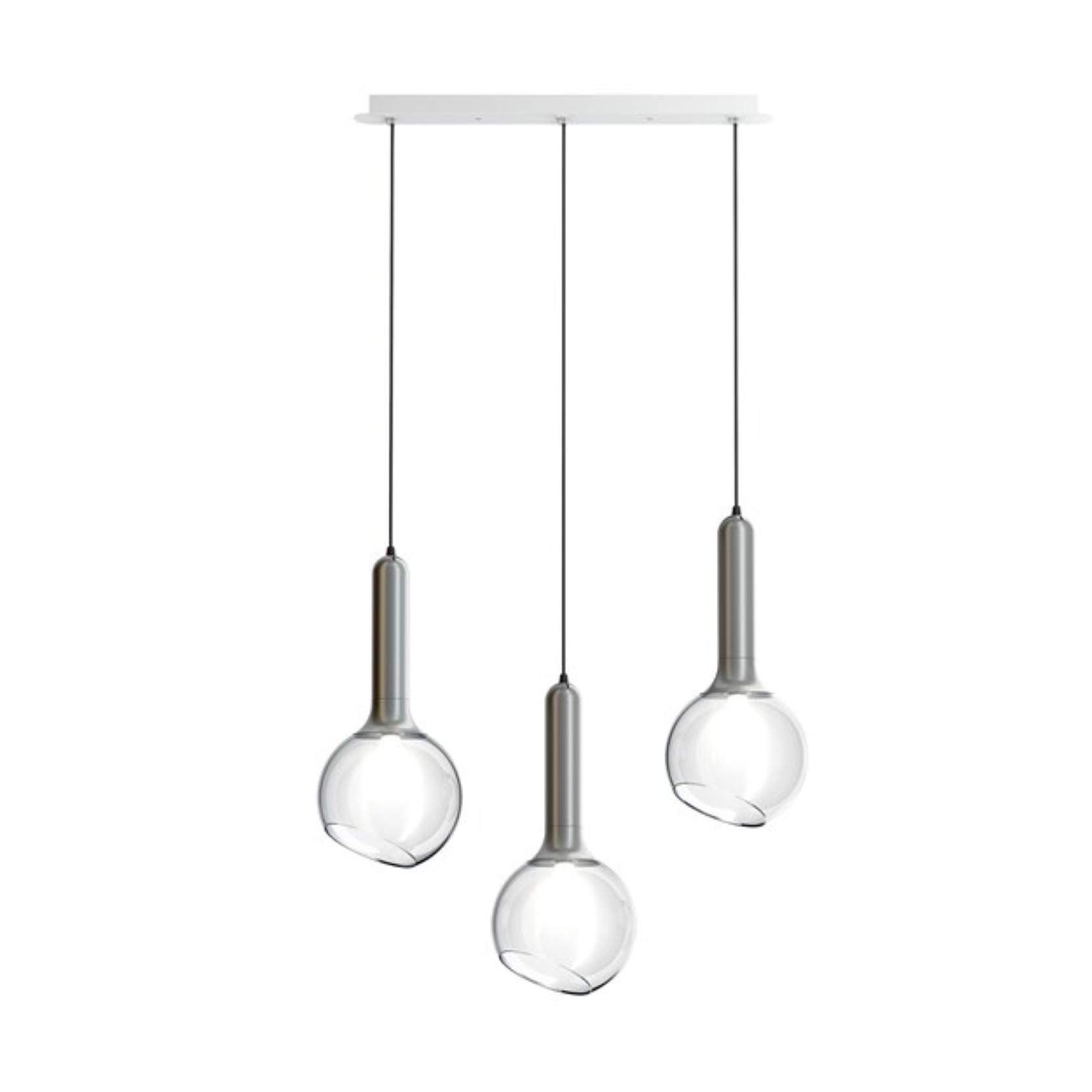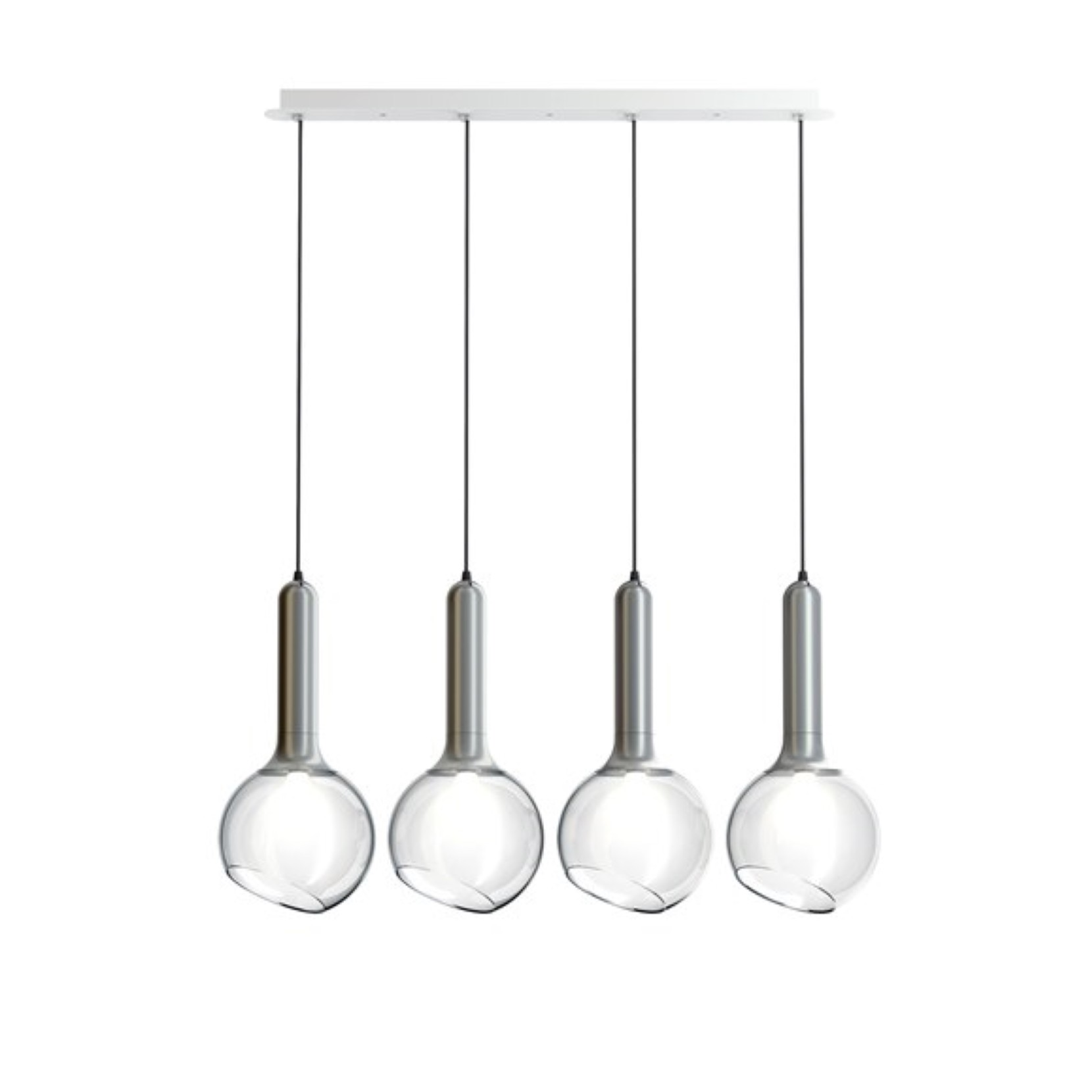 LUCK is a versatile collection, designed by Valencian designer Ximo Roca. The lamp has a bell-shaped metal structure in the center that contains a crystal ball. The bulb inside is completely visible, allowing white light to flow from all sides, giving the effect of an unfinished object thanks to the original cut in the base. Hanging lamp with direct and indirect light in transparent glass, diagonal opening on the bottom. The height is adjustable and can be used on sloped ceilings.