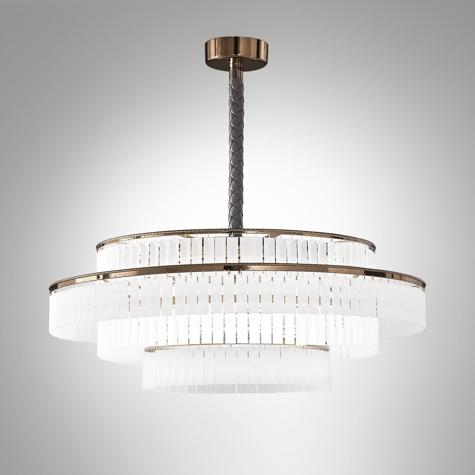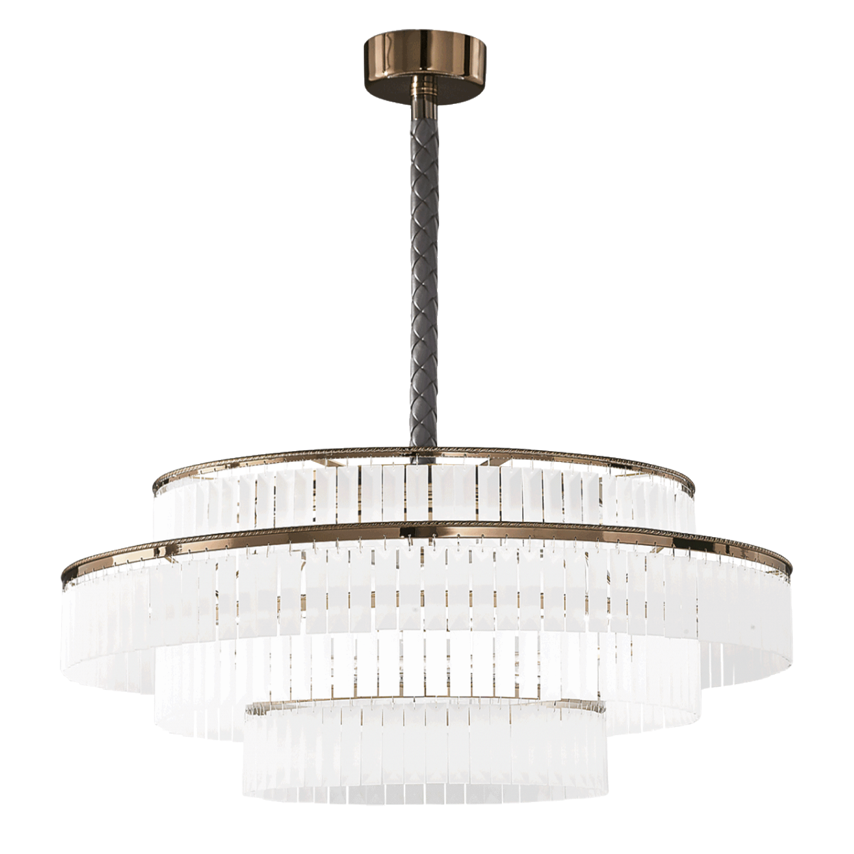 724 Charles is a collection of lamps designed by Italamp Studio, made with glass pendants etched diffused light and leather and Swarovski details, is suitable to illuminate and furnish any type of environment. The materials used for the lamp are: metal body, glass diffuser, plexiglas, glass pedaglieria, metal hardware. The finishes that can be requested are: Nickle gold body, satin diffuser, satin pedaglieria, nickel gold hardware.