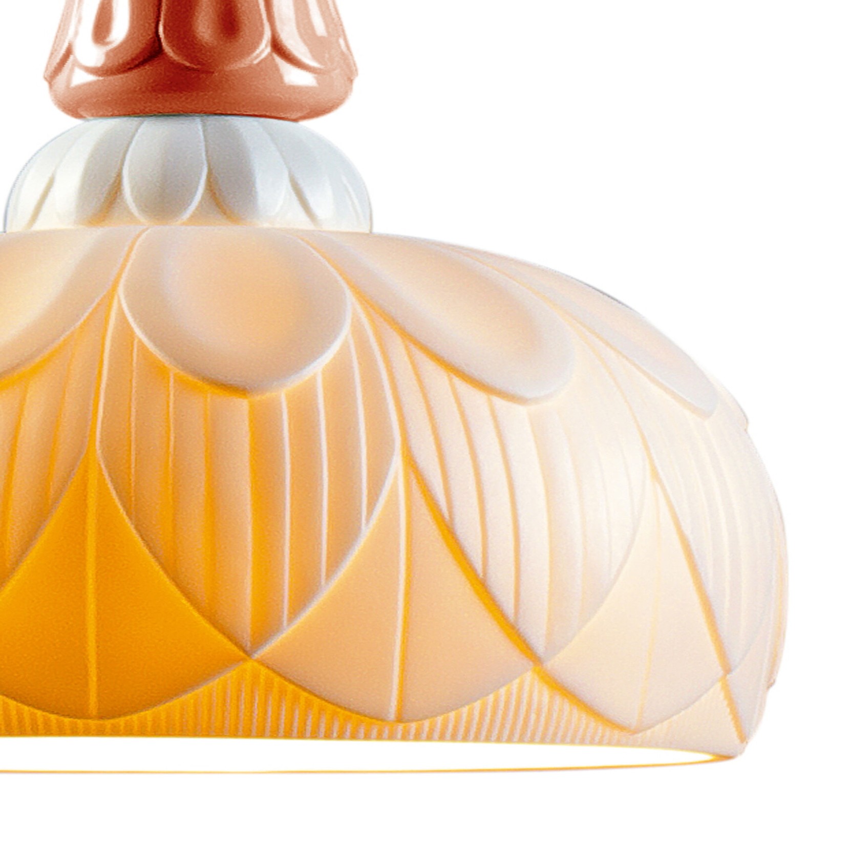 Suspension lamp inspired by plant motifs, interpreted by round, organic and geometric lines. The design of the collection is dominated by synthetic, feminine, round shapes, without borders, typical of porcelain. Coral finish with translucent white lampshade and white porcelain top.