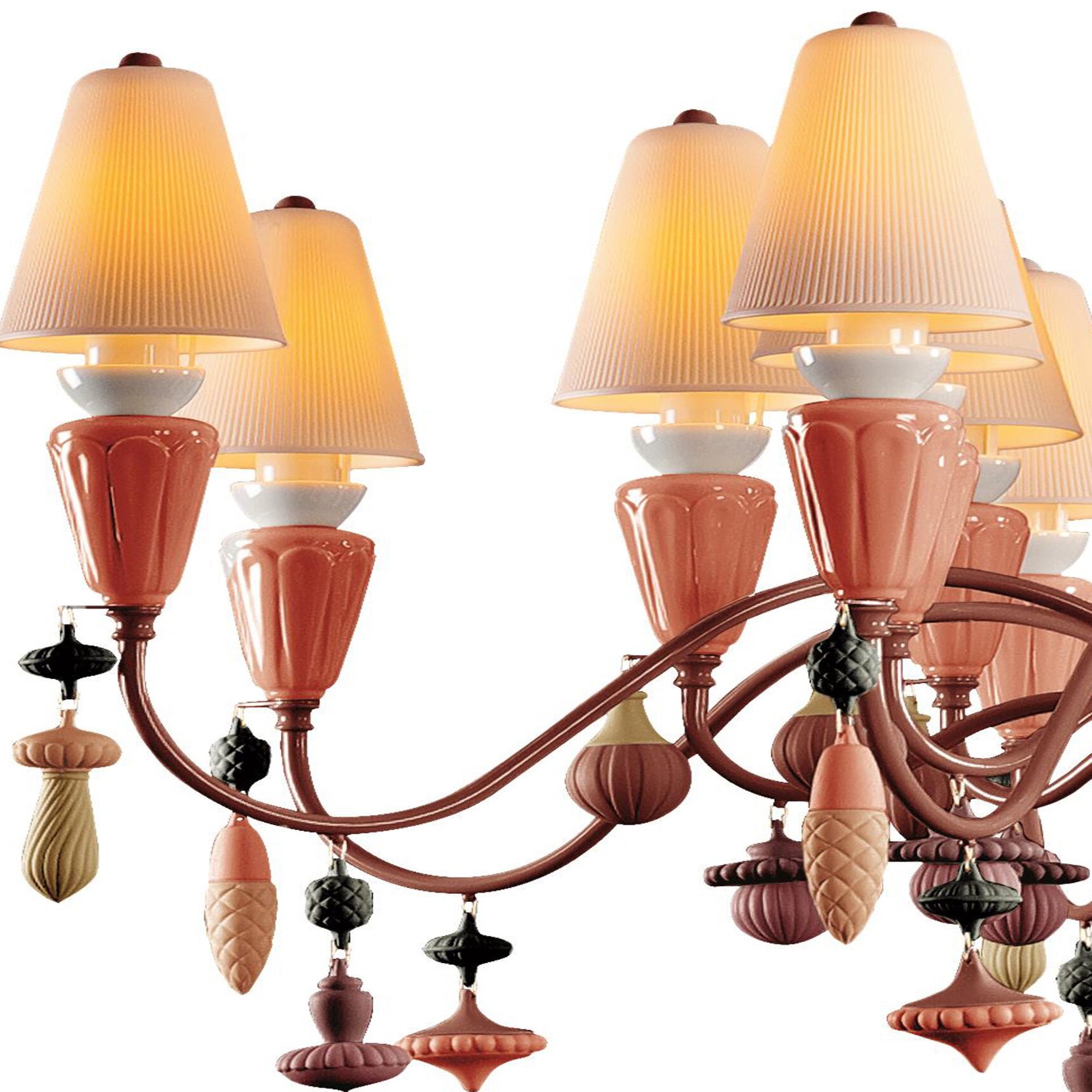 Suspension lamp with sixteen lights inspired by plant motifs, interpreted by round, organic and geometric lines. The design of the collection is dominated by synthetic, feminine shapes, transformed, without edges, typical of porcelain. The pendants are reminiscent of seeds and bulbs; the bases of the lights and other elements of the central part remind us of leaves and flowers in bloom; the lithophanes are inspired by forms of wild mushrooms. The range of Coral Red colors is inspired by the beauty of this rare and delicate species and its inimitable color.