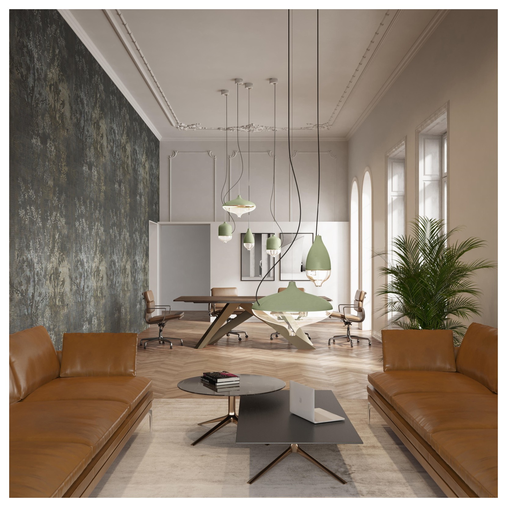 The lampshade can be in terracotta, black, grey, green tones. The lower part can be made with opal or transparent glass.