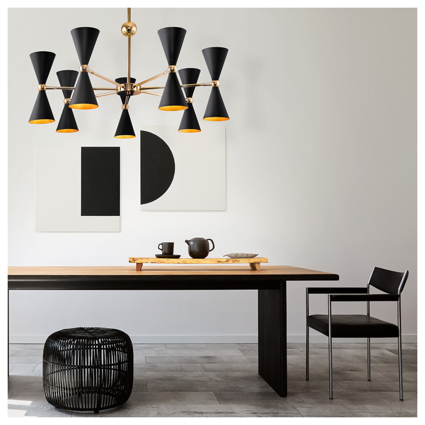 The VESPER pendant lamp consists of a gold-colored metal frame. The color of the speakers is characterized by the combination of two colors: black and gold, white and gold. Vesper is special because the speakers are swivel with adjustable light.