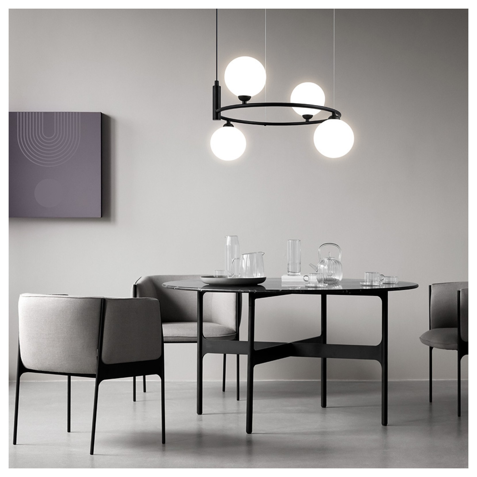 The RING pendant lamp sees the combination of two materials: glass and metal. Ring comes with a metal structure in brass, white or black surrounded by frosted glass lampshades.