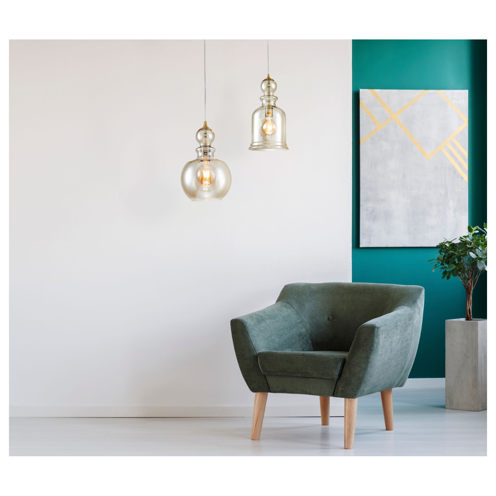 The TONE pendant lamp has a metal structure with amber glass diffusers, the height of the lamp is adjustable by the length of the rope. The lamp is suitable for both modern and classic environments.
