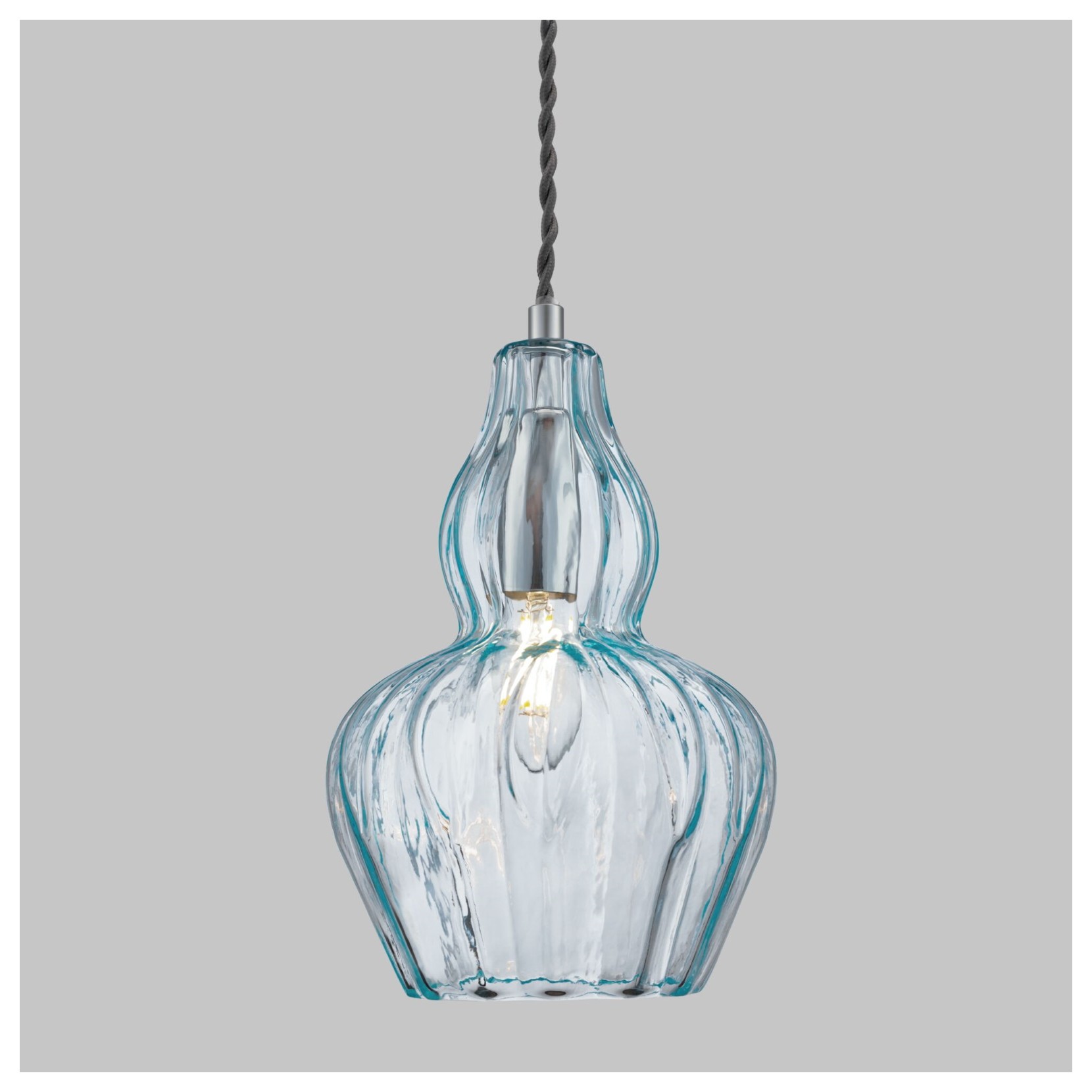 The EUSTOMA pendant lamp with an elegant cut with geometric surfaces is composed of a metal structure and diffusers in blue, smoked or transparent blown glass. The height of the lamp is adjustable by the length of the rope.