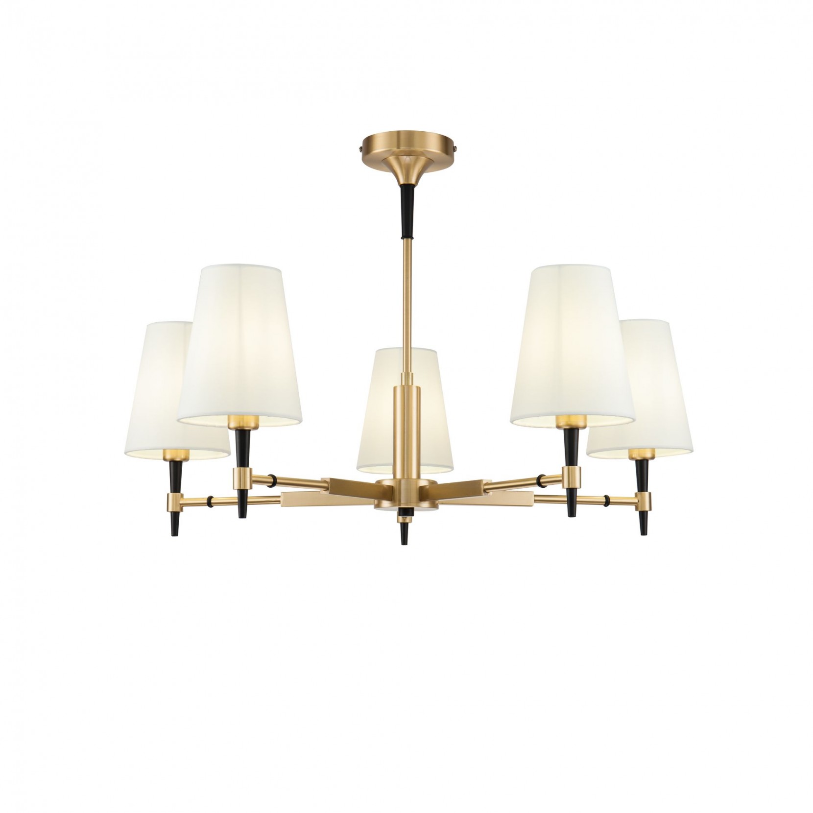 The ZARAGOZA pendant lamp consists of a brass metal frame with black elements. Zaragoza is equipped with five PVC lampshades covered with fabric.