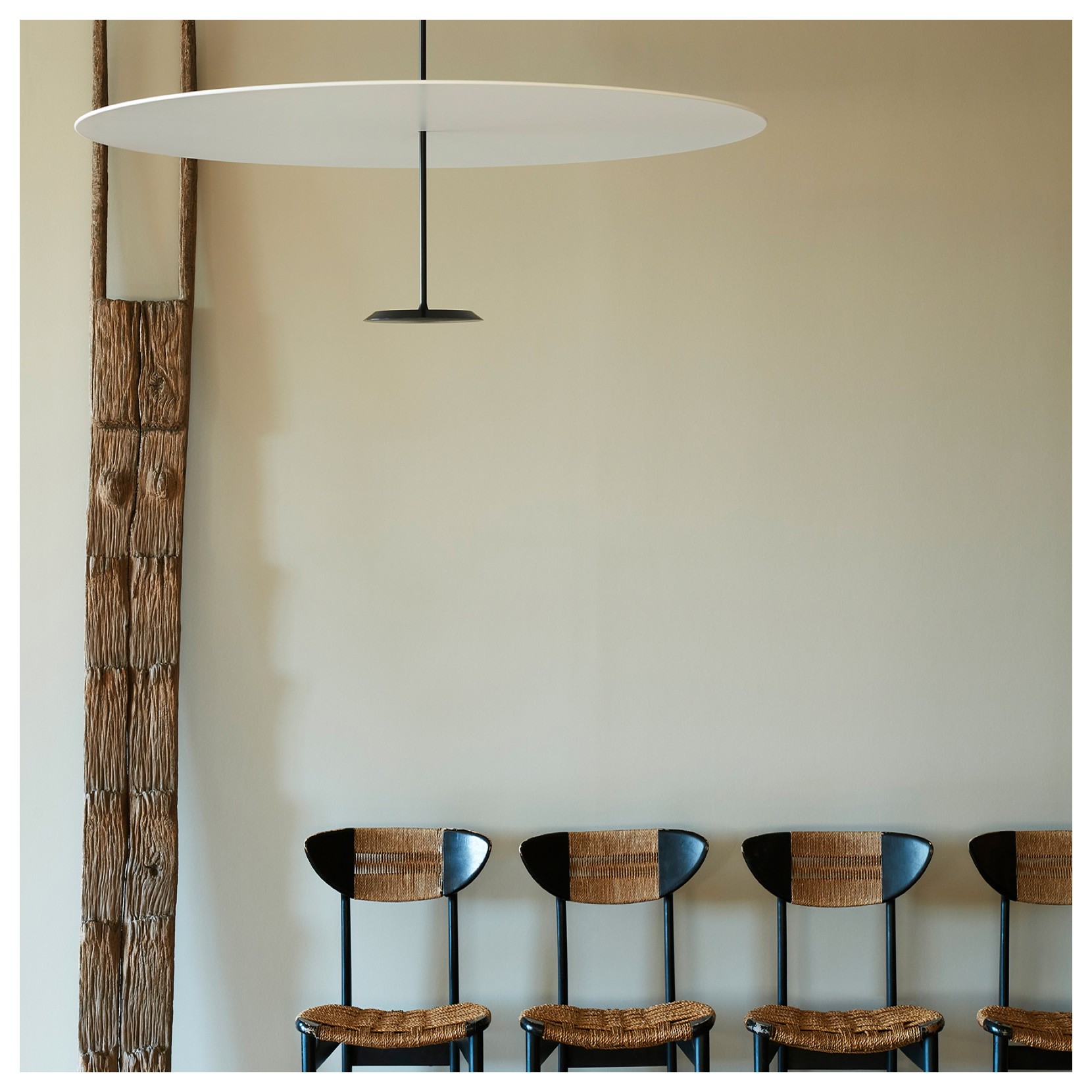 The DOT pendant lamp is a design but functional lamp. The lamp consists of two parallel aluminum discs of different sizes, where the smaller disc contains a ring of LEDs. DOT is available in three different diameters:110cm (55W),80cm (41W),60cm (23W). There are also two finishes: anodized brass and anodized black.