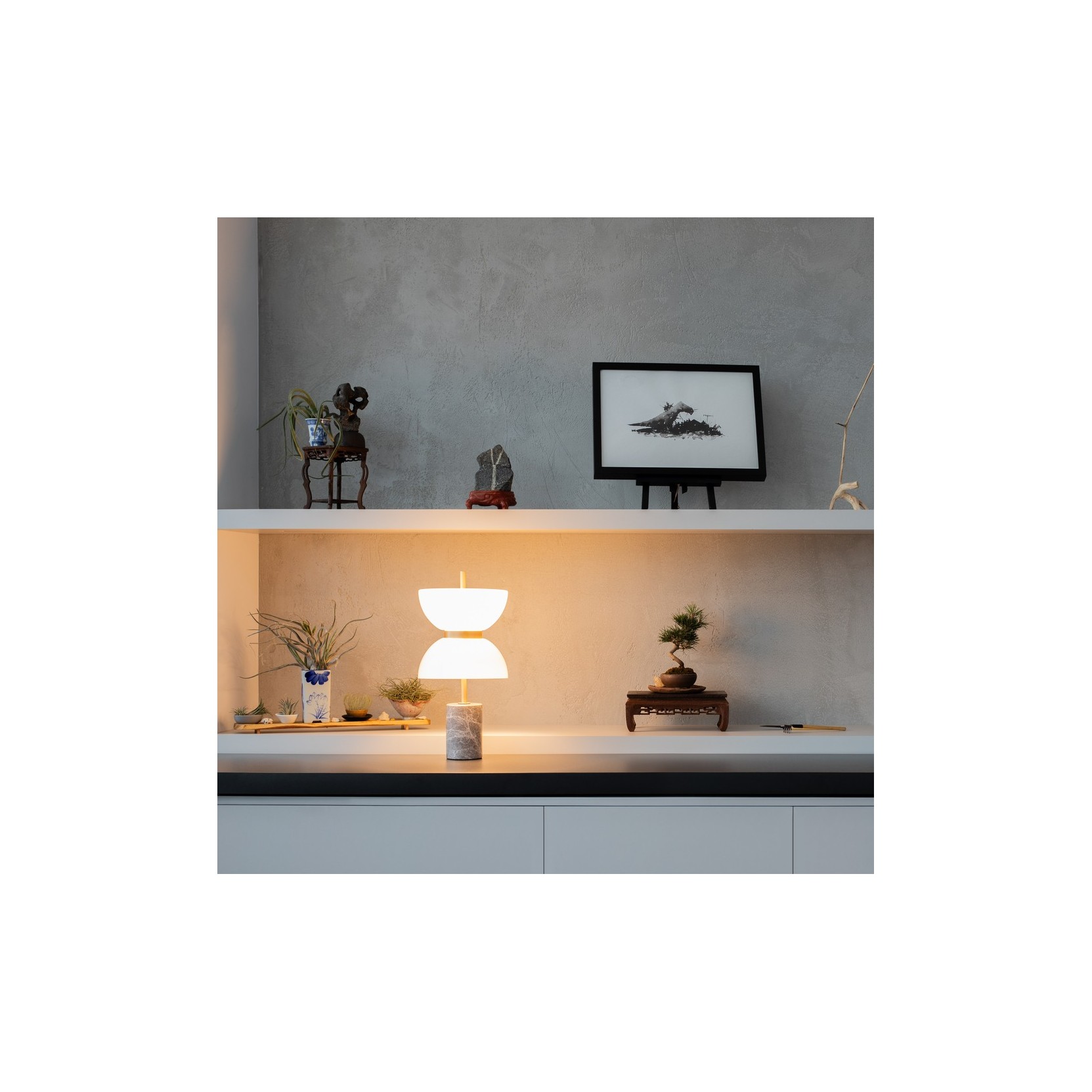 The Kyoto lamp stands out for its rigorous design that plays on the repetition of primary shapes. Featuring a solid cylindrical base, the structure supports two white opal glass hemispherical diffusers arranged in a mirrored layout. This hourglass configuration not only creates an impeccable visual balance but also transforms light into a volumetric element that defines the space with elegance and discretion.