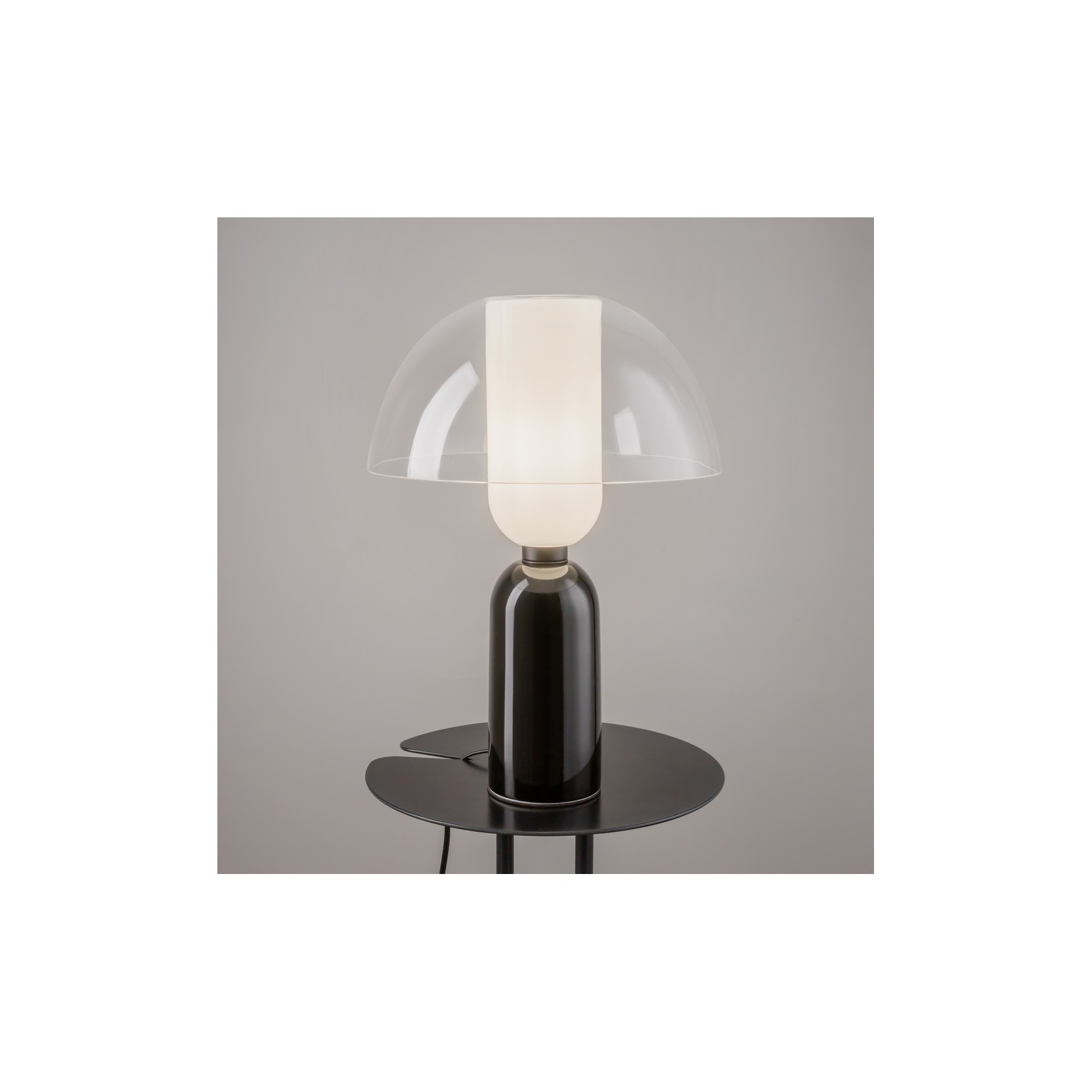 The Memory lamp stands out for its iconic silhouette based on a play of symmetries and opposing volumes. The structure consists of a solid cylindrical base in matte black metal (or technical ceramic), from which a slender stem rises to support two white opal glass hemispherical diffusers. Arranged in a mirrored fashion, the two shells create a stylized hourglass shape that harmoniously diffuses light both upwards and downwards.