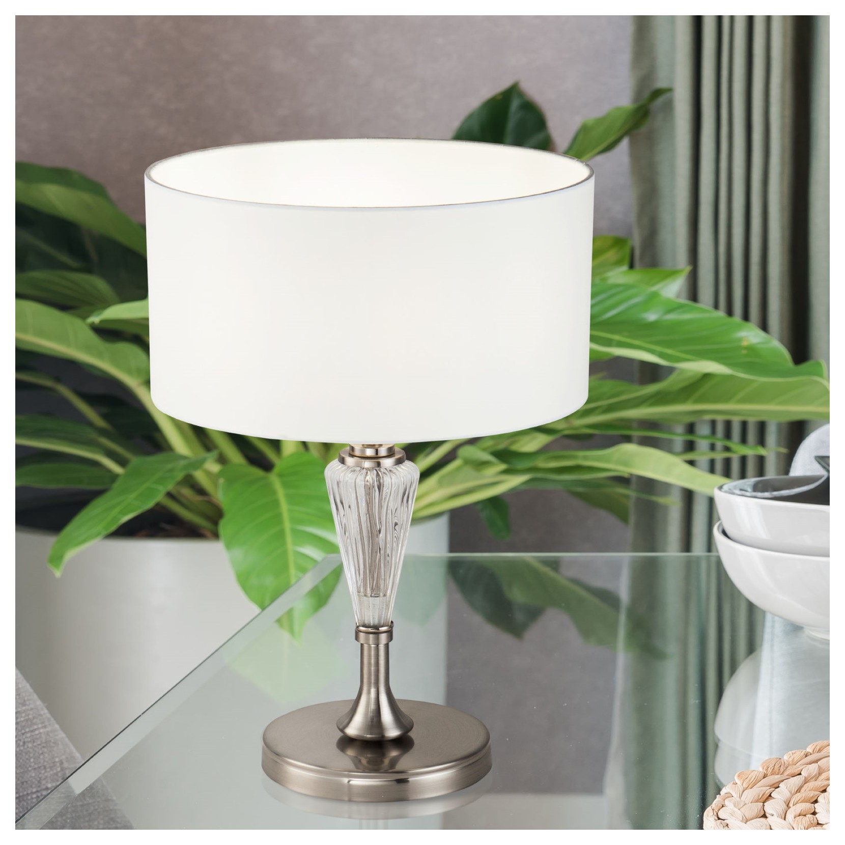 ALICANTE is the table lamp with metal structure and decorative glass elements. The PVC lampshade is covered in white fabric. Alicante is suitable for environments such as a living room, bedroom making the environment warm and cozy.