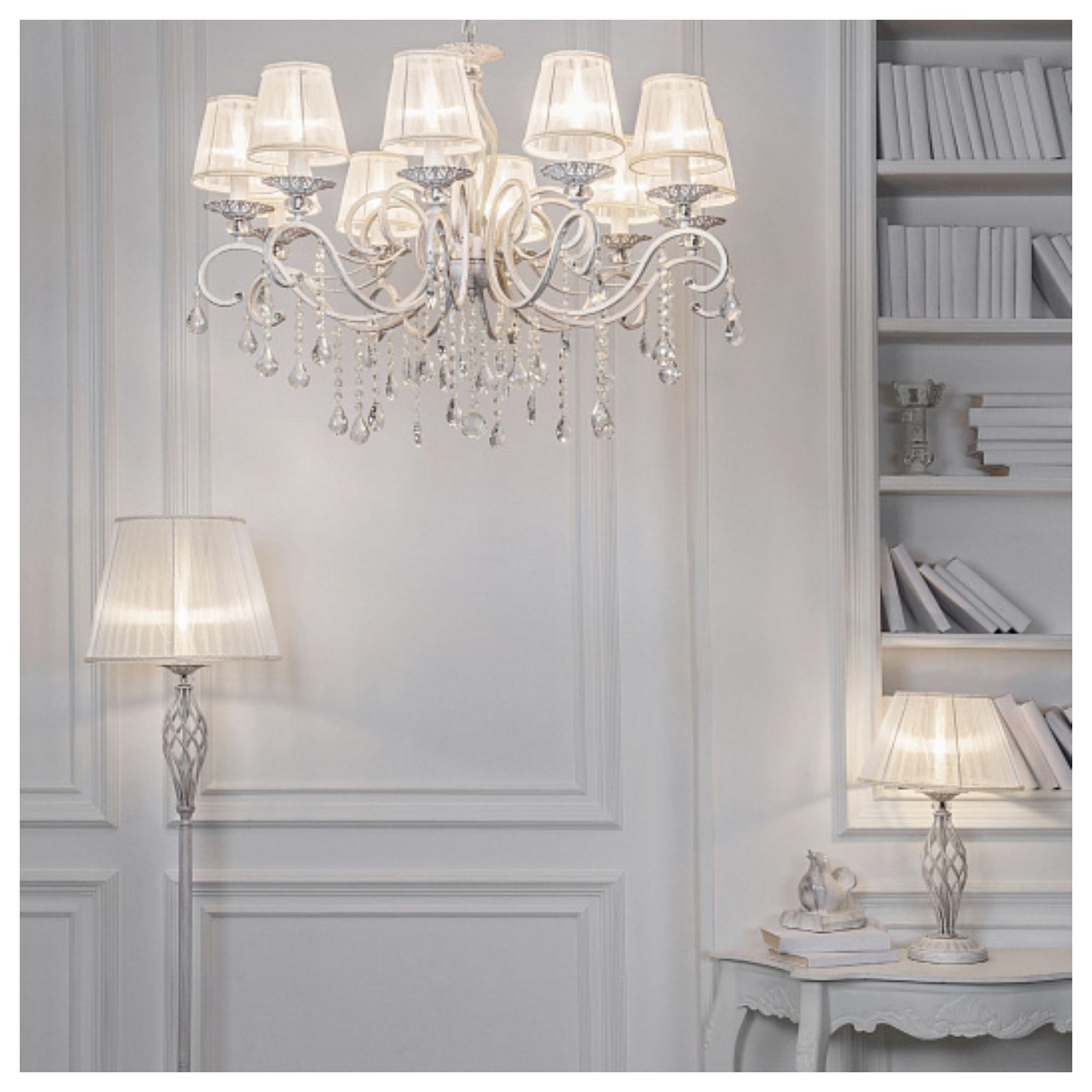 The Grace table lamp consists of a white and gold metal frame. The particular structure consists of a lampshade in pleated white organza with decorative crystal elements.