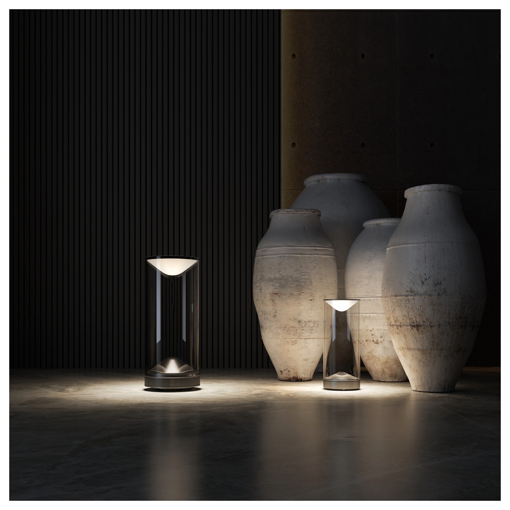The EVA table lamp has been designed by taking a candle with the aim of creating a warm and welcoming atmosphere. The cylindrically shaped aluminium base contains the electronic components, the optics and the LED that remains hidden.