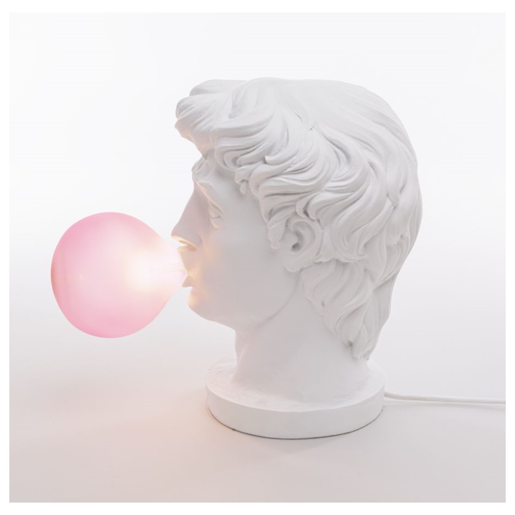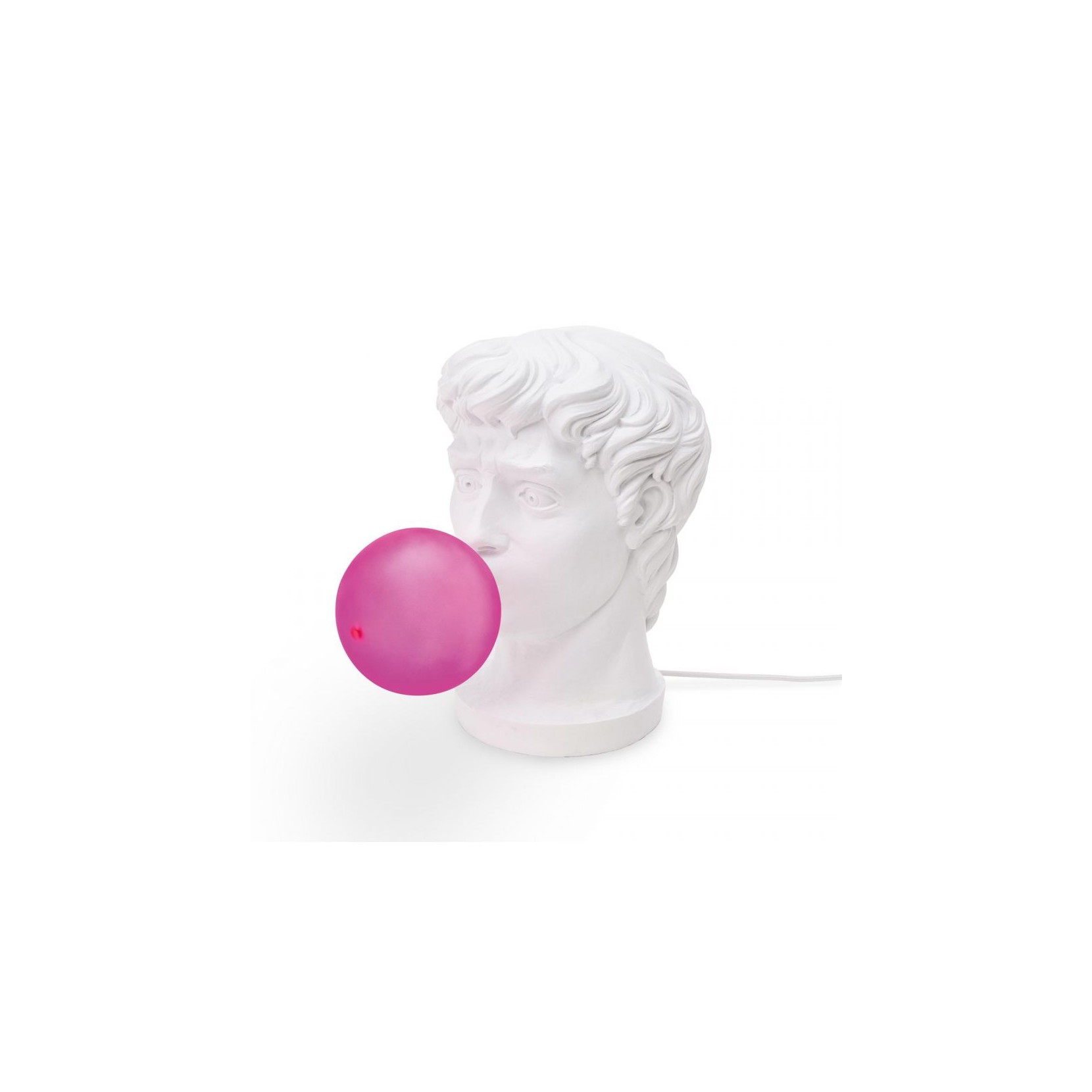 What would it be like if suddenly a classic warrior made a chewing gum ball and La lampada da tavolo SELETTI disegnata in collaborazione con il designer Uto Balmoral, raffigura il volto di un guerriero classico che mastica chewing gum, amazed by what he can create with his mouth.