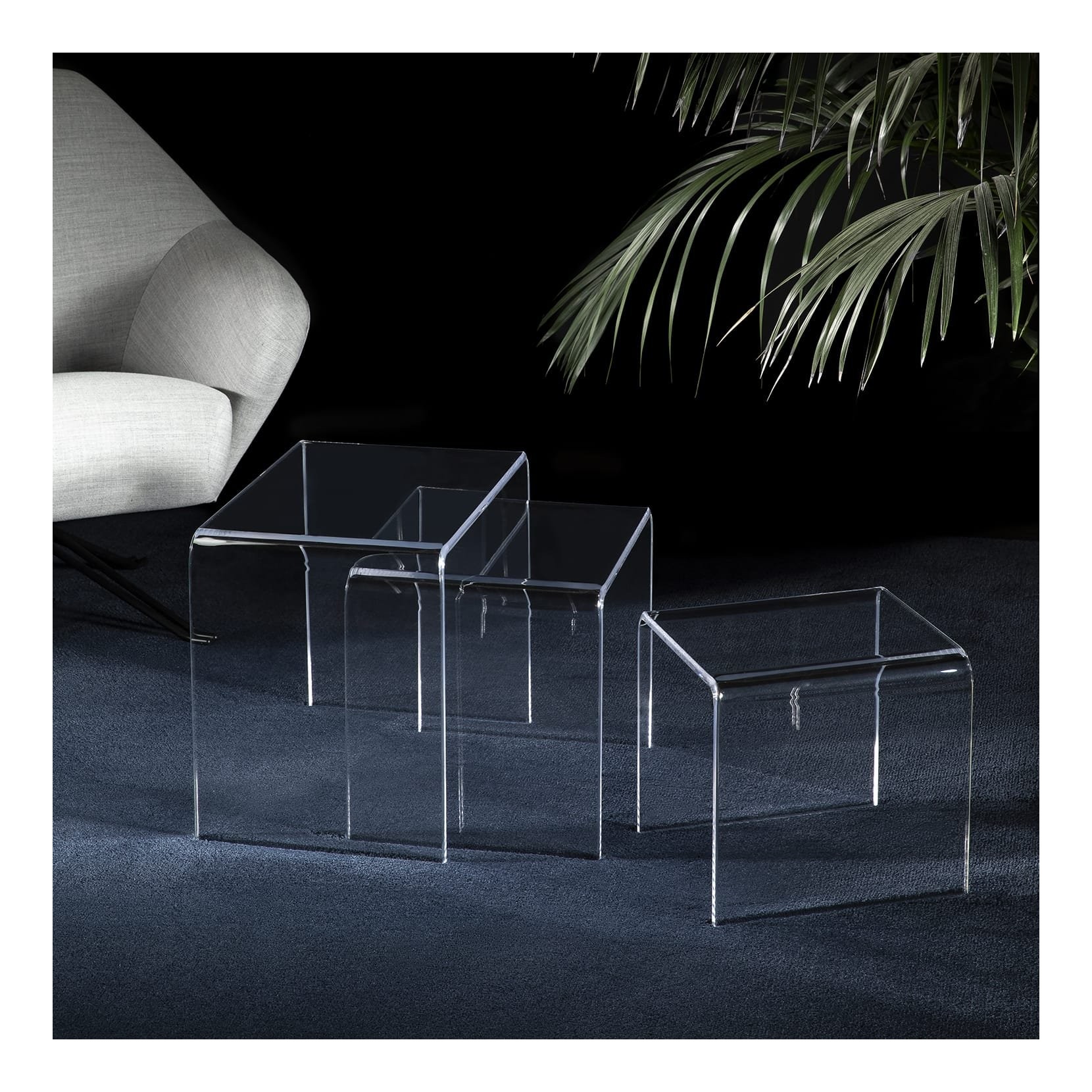 Simply is a set of 3 transparent coffee tables with a modern design and that suits any decor style. They are available as space-saving and multipurpose coffee tables. They can be used to display ornaments or as coffee stands.