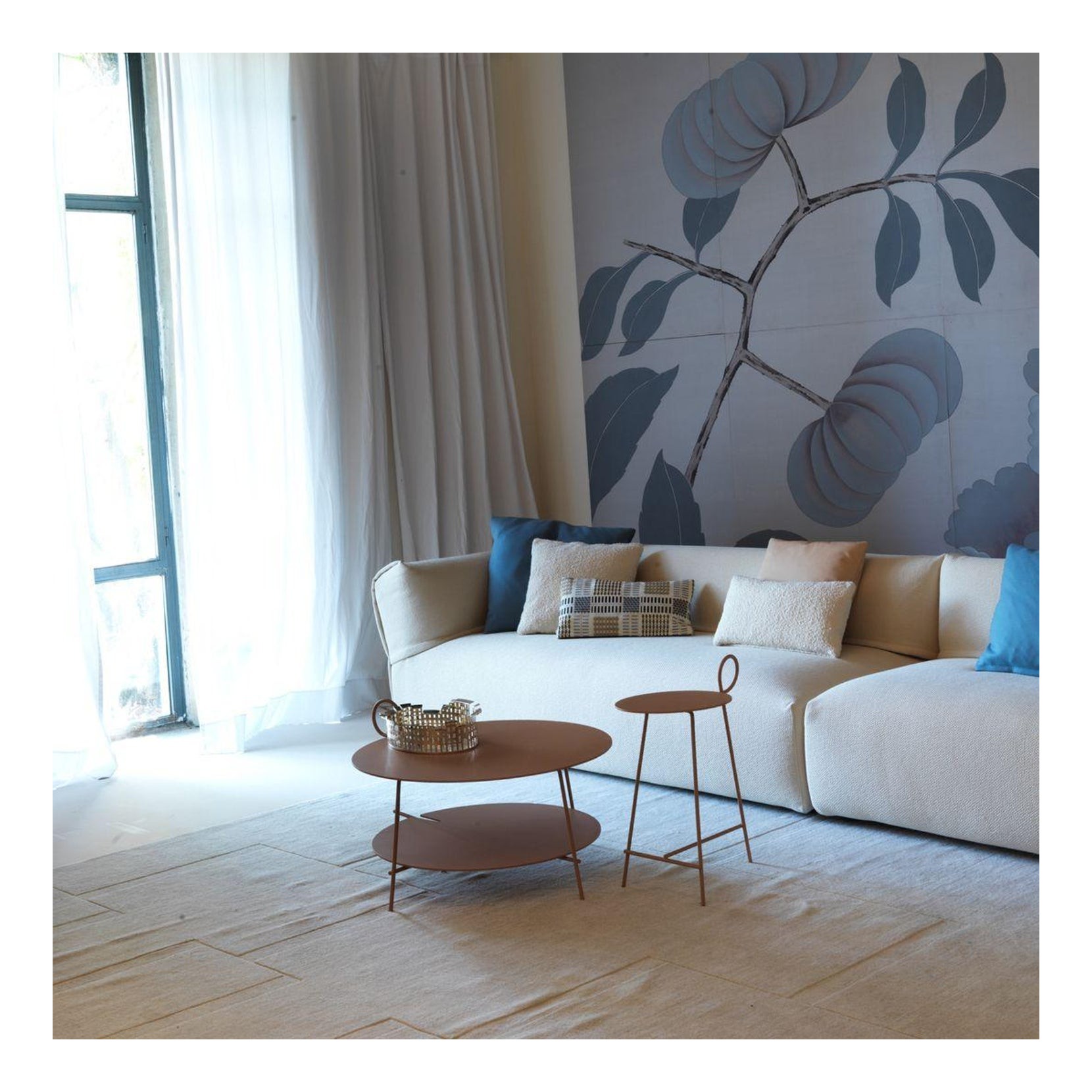 Carmina is a coffee table in steel rod and aluminium sheet tops with delicate lines designed by Ludovica + Roberto Palomba. The side curl is what makes this unique object that with its shapes invites to dream and quiet.