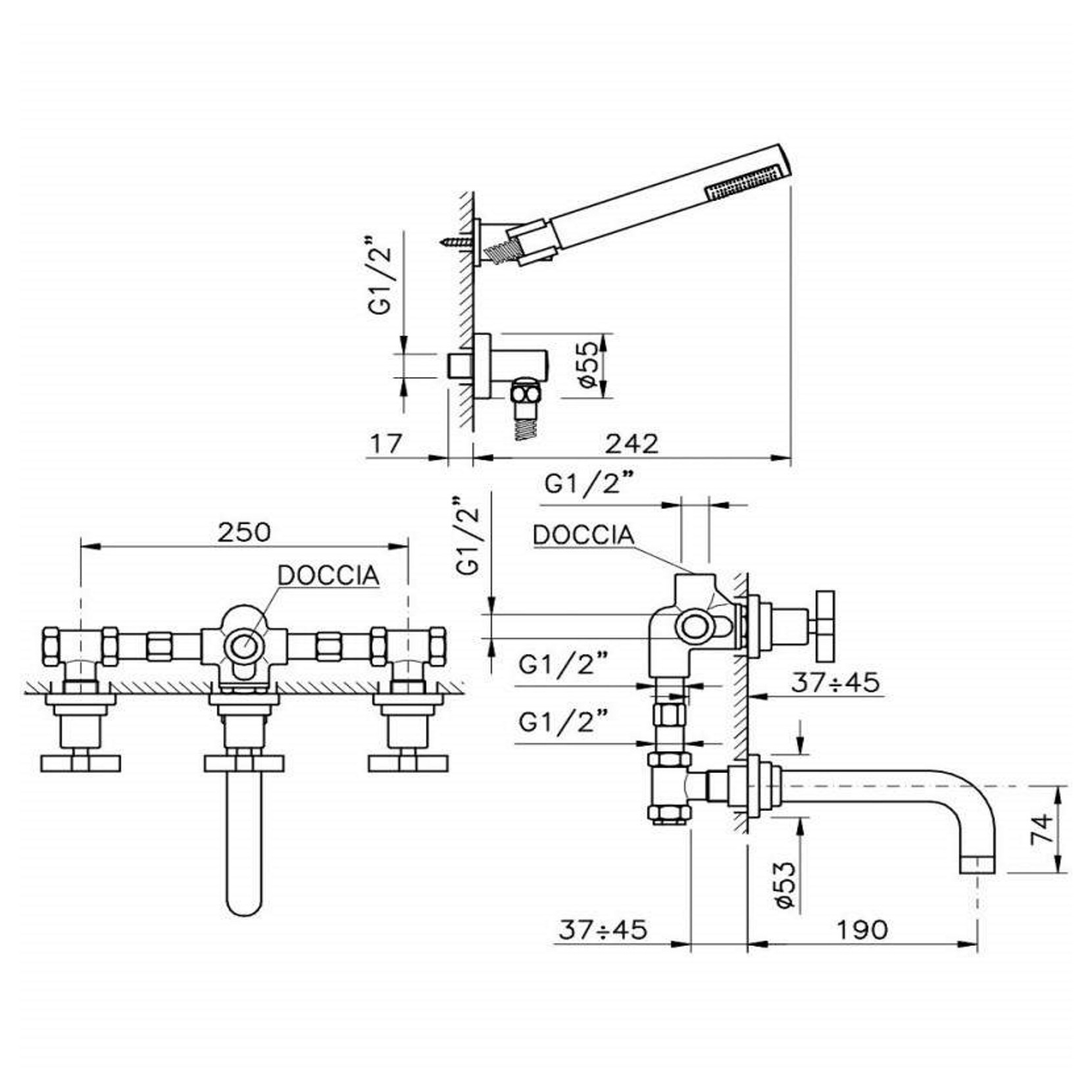 Monte Croce, Mac Kinley 05 by Officina Nicolazzi offers a wall mounted recessed bathtub unit with a brass structure. The non-invasive and refined aesthetic has soft and sinuous lines that give the bathroom modernity but at the same time refinement. Monte Croce has two cross-shaped handles that are easy to use and always up-to-date. It is composed of a diverter through which you can decide the use of the shower or anti-limestone for a quick but comfortable shower or fill the bath through the spout, to make a comfortable and relaxing bath.