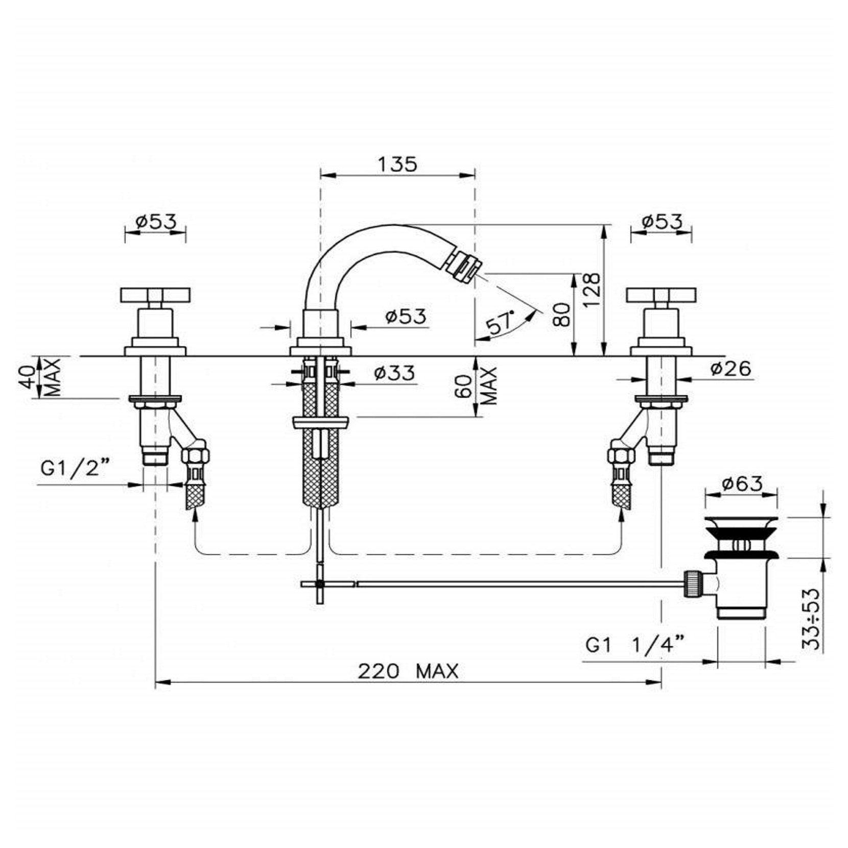 Monte Croce by Officina Nicolazzi, external bidet battery, brass structure. The lateral, cross-shaped operating handles are easy and comfortable to use, giving an extra touch to the environment. Monte Croce has a refined and elegant design with the slightly curved spout in order to clean and wash at best even all the corners of the bidet.