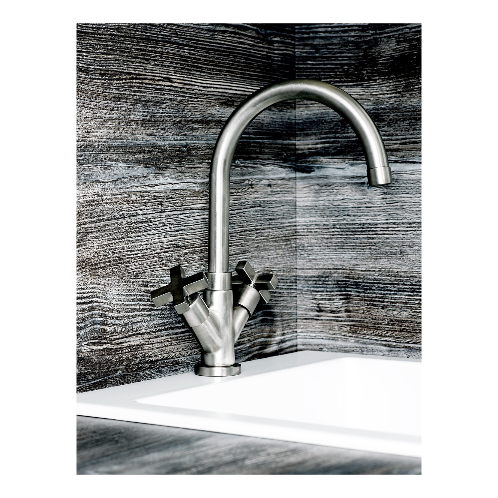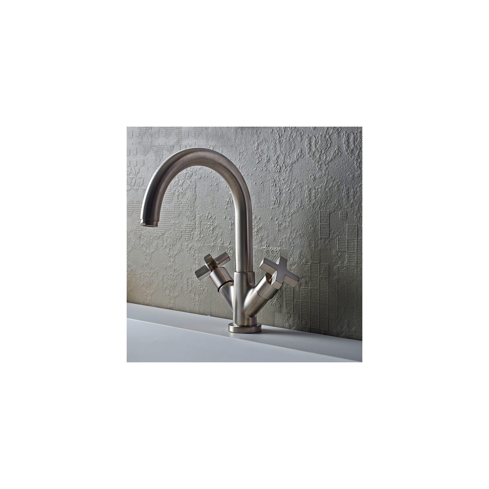 Monte Croce di Officina Nicolazzi, Monohole automatic drain basin, swivel barrel and ceramic vitone, brass structure. The lateral cross-shaped operating handles are easy and comfortable to use. Monte Croce has a refined and elegant design with a curved and adjustable spout to facilitate the cleaning and washing of all the corners of the basin. Available in different finishes.