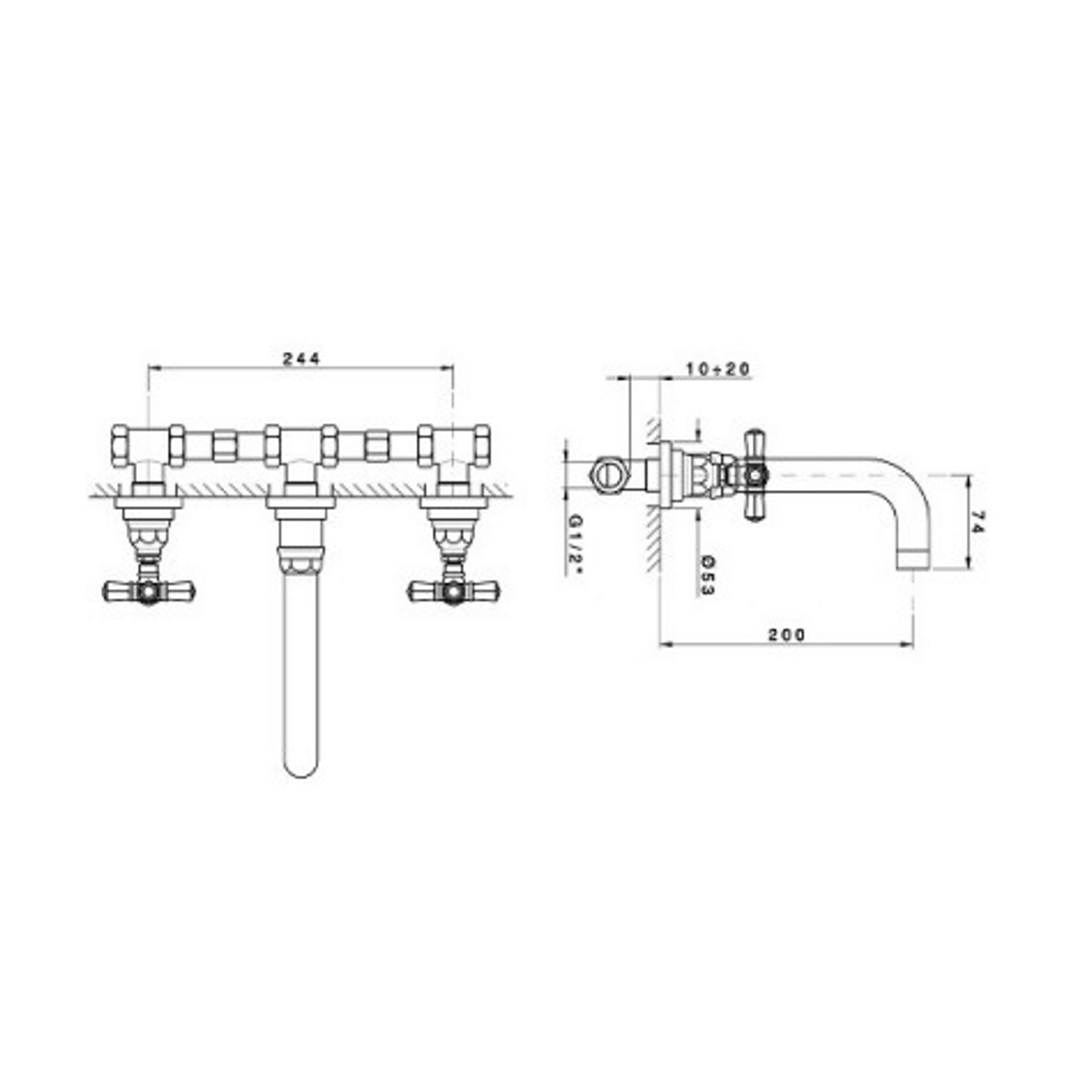 Agorà by Officina Nicolazzi, wall-mounted washbasin battery with structure entirely in brass and with ceramic vitone. The series is characterized by a strong and decisive line. The accuracy of the details and shapes provides this minimalist line with some more classic sides allowing adaptation to both environments with minimal furnishings and more recent settings.