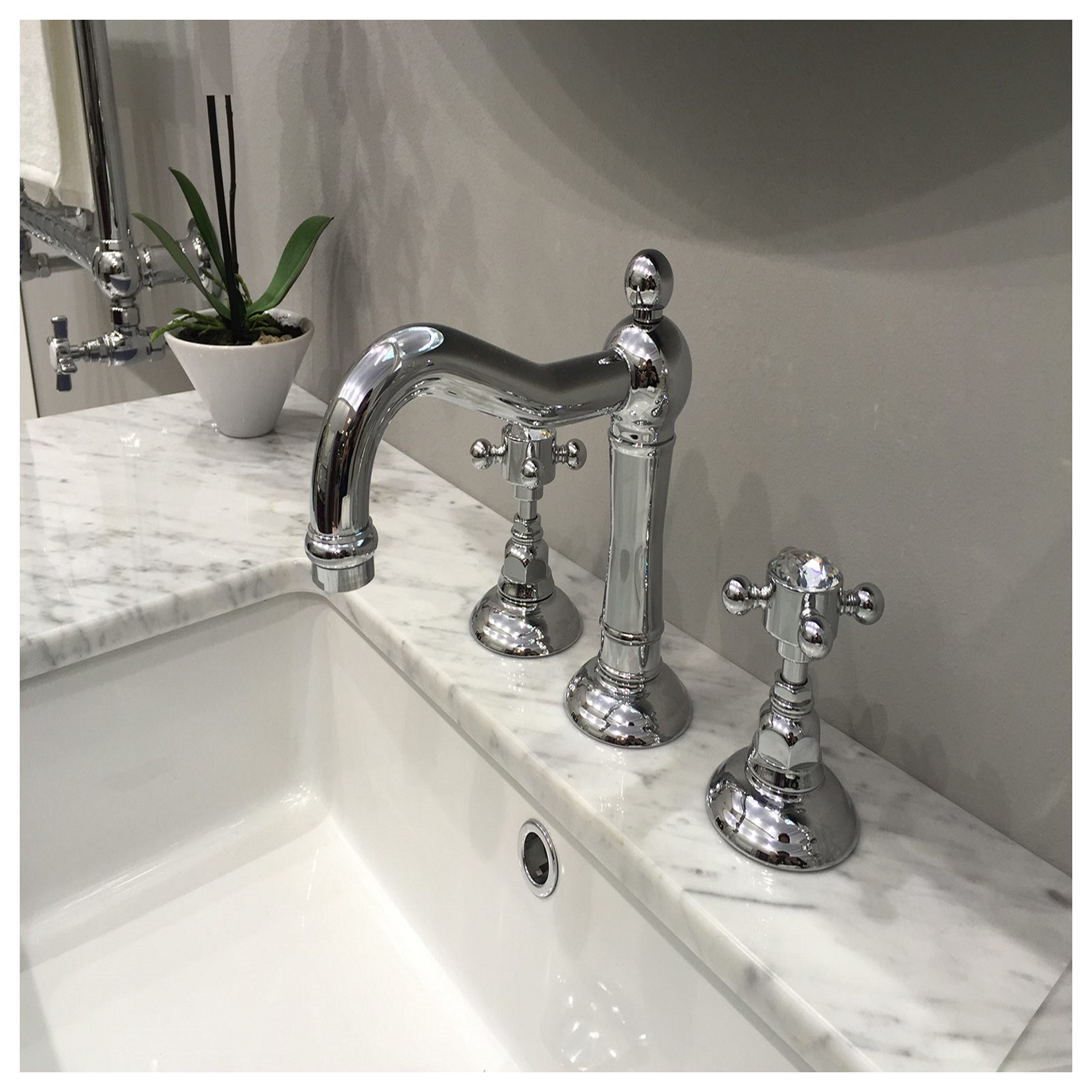 Officina Nicolazzi proposes the Half Dome Crystal collection, it represents the essence of the neoclassical style. The series proposes the exaltation of traditional tap lines with the use of Swaroski crystals. The structure of the faucet is entirely in brass with ceramic vitone, embellished with very fine details and curves. The collection is available in two versions, with a cross handle the Half Dome Crystal or with a lever the Cristallo Liberty.
