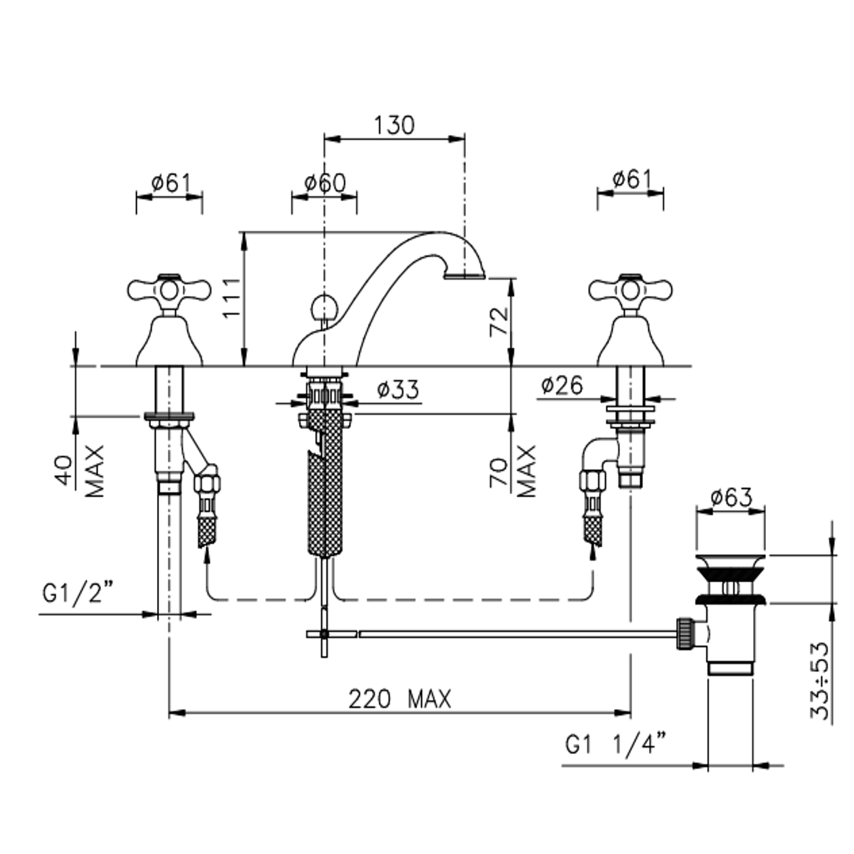 Officina Nicolazzi proposes the Nuova Brenta series, structure entirely in brass with ceramic vitone. The series is one of the most complete as it includes four different types of three-hole or single-hole washbasin solutions with the possibility of two different handles.