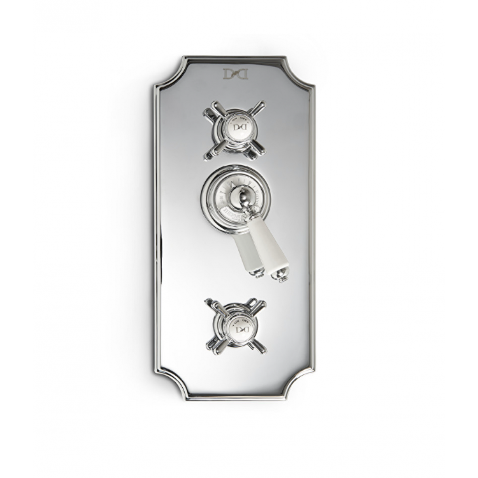Inspired by the nineteenth century and the sober and refined design DANDY, wants to pay tribute to the classic style. The thermostatic 2-way recessed,  with lever in fine white porcelain. The brass structure is available in different color finishes: Bronze, Chrome, Polished nickel, Light gold.